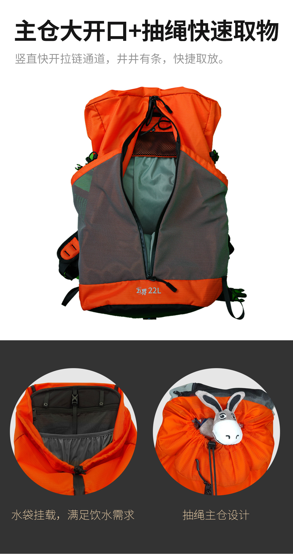 ✅ 科学分仓——主仓+水袋仓+袋鼠仓+顶包+独立收纳,满足驴友的不同装备收纳需求!