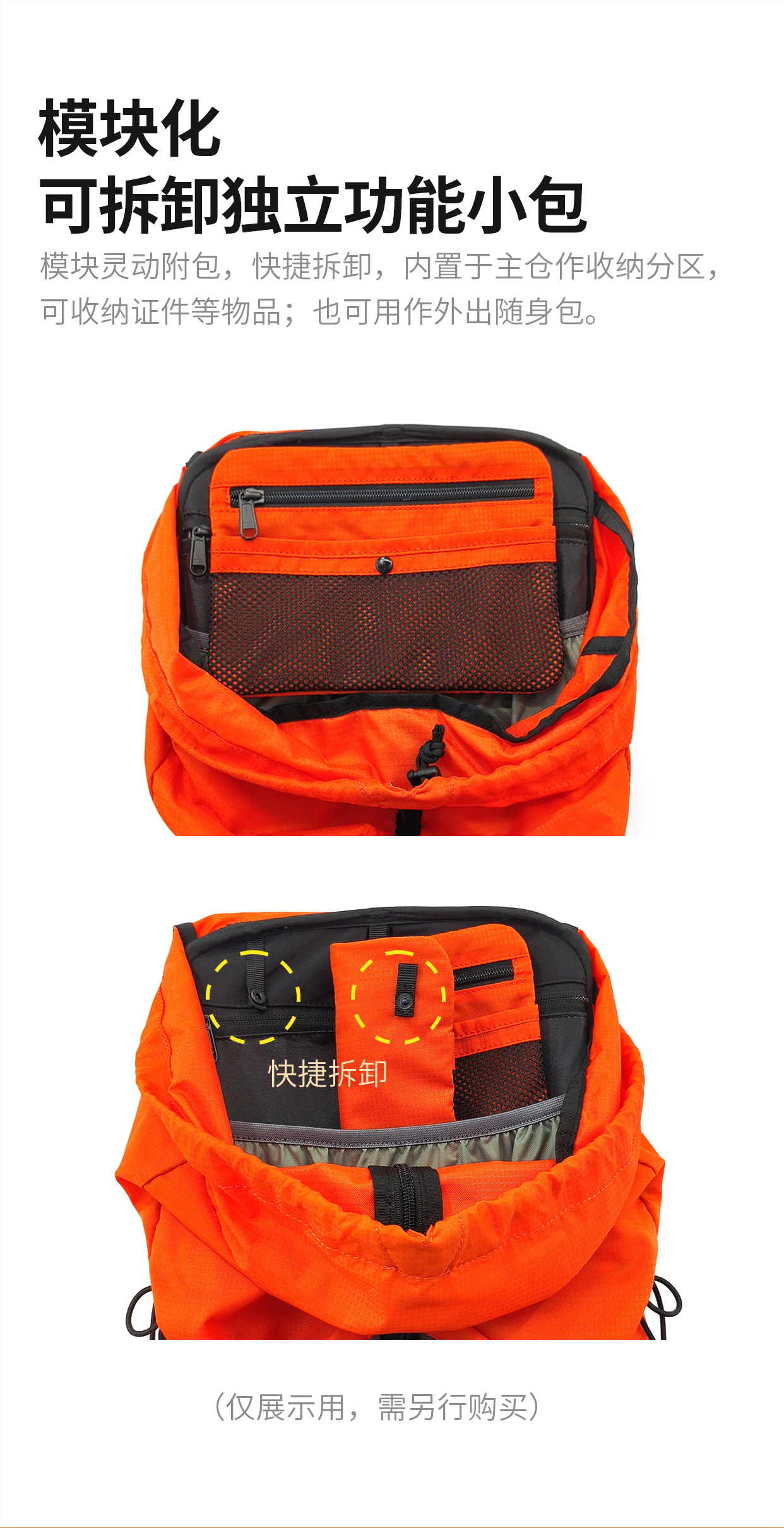 ✅ 模块化附包——预售福利送可拆卸胸包/灵动小包,徒步变“百变背包”,手机、充电宝等随手拿!