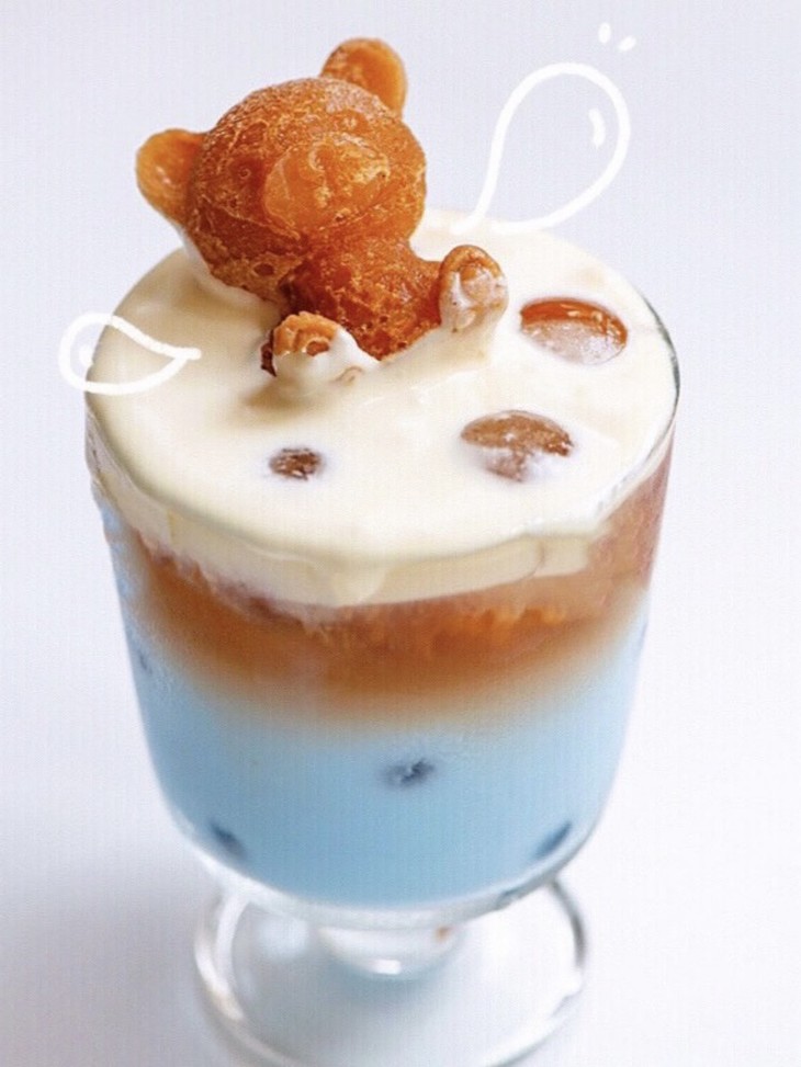 3.杯中加入适量冰块儿,倒入蝶豆花牛奶,倒入咖啡,加入牛奶奶盖,加入咖啡小熊冰块儿,完成
