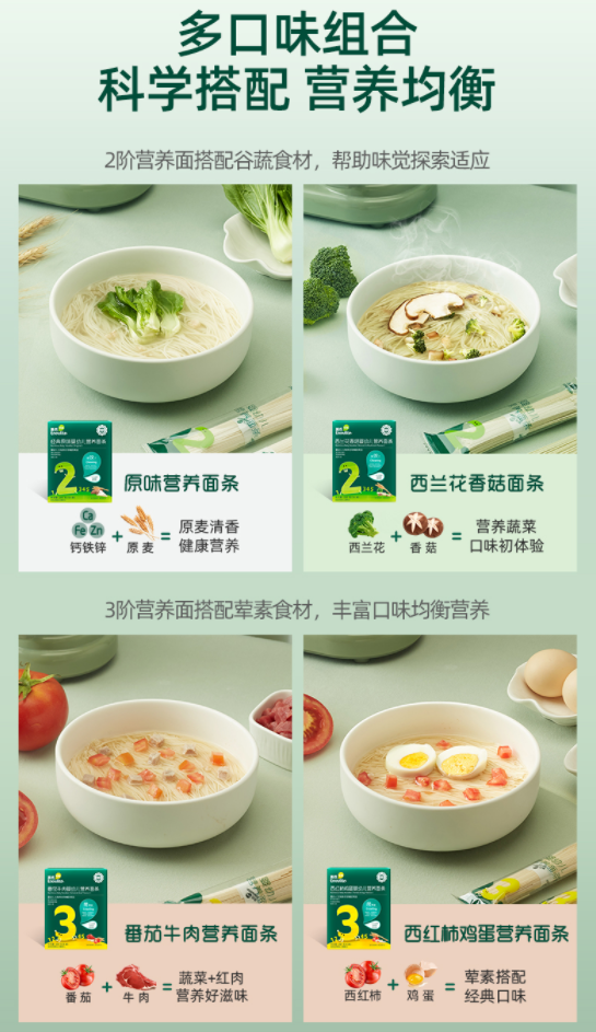 英氏忆格婴幼儿营养面,根据科学5阶精准喂养体系指导,推出分阶辅食,同时在分阶辅食面条中特别加入宝宝生长发育所需营养,多种营养助力健康成长