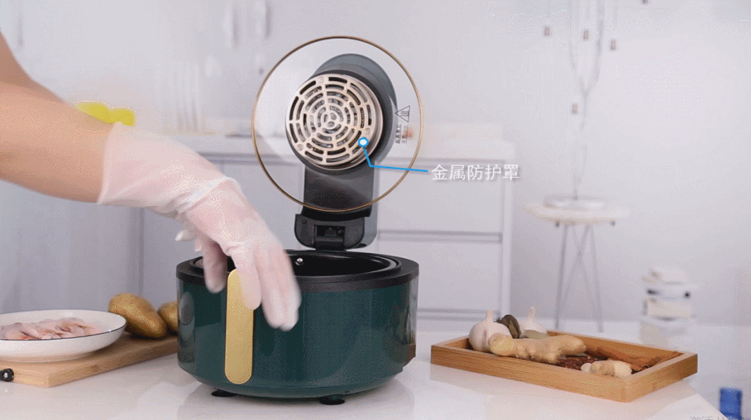 这款空气炸锅内置微动开关,打开玻璃盖,机器会自动断电。