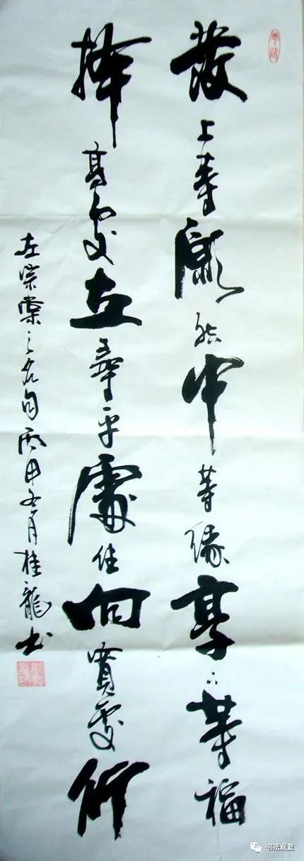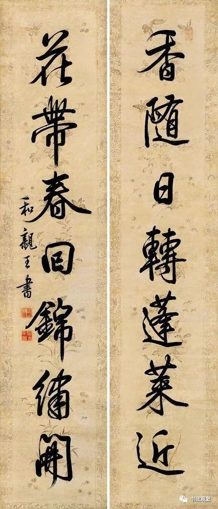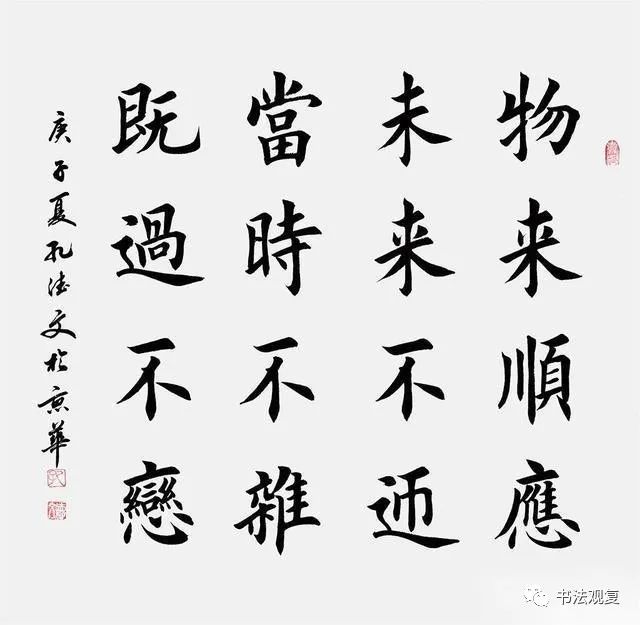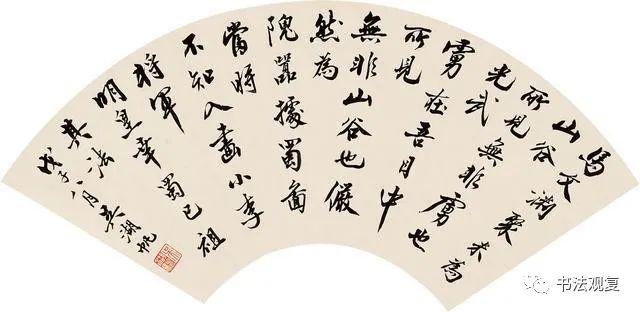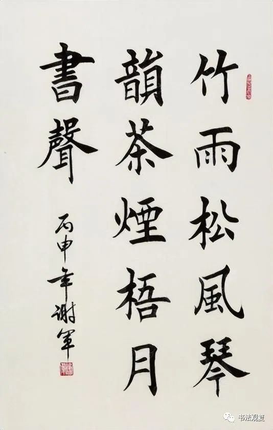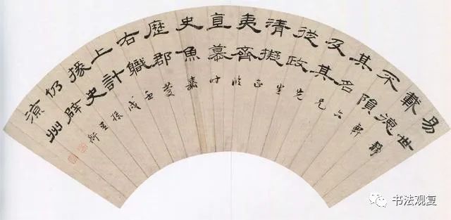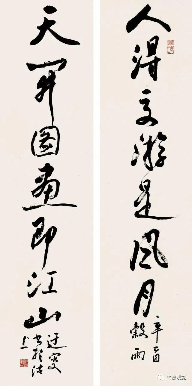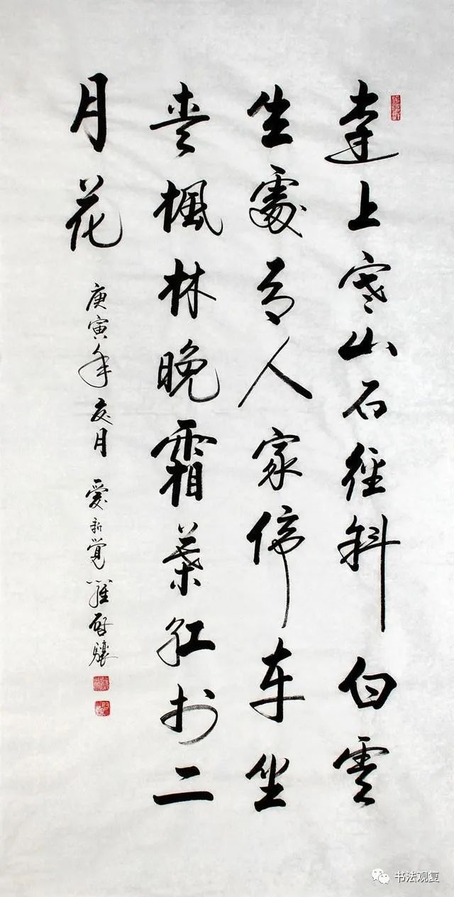 斗方是书画的正方形画幅,最常见的就是四尺斗方,它由四尺的整张宣纸对裁成两份而成。也可以把宣纸裁成八份,一尺见方的小斗方,又称“小品斗方”或“斗方小品”由于斗方格式的独特性,在书写时对空间安排需合理得当,才能让形式辅佐内容更富韵味;其次要注意正文与落款的书写关系,落款可写在正文末行的下面,也可以在正文后面另起一行或两行;另外印章要小款字且适当留白,才可与正文相呼应。如用四尺宣纸则为四尺三开,如用五尺宣纸则为五尺三开,以此类推。四尺三开:69×46(标准四尺宣纸长度1/3,宽度不变),写楷书需折格,行书则不用。以长宣纸全开及对开(半截或半折),直书之作品为条幅。单独悬挂为“条幅”,一组作品并挂为“条屏”或“堂屏”,有四条屏,八条屏以系列作品数量命名。在书写条幅格式时,要根据章法合理安排布局,创新构思,为避免死板,落款上下一般不与正文平齐。两张对开的有上下文联系的条幅,也叫“字对”或“对联”。像明清绘画有“画对”,两幅大小相等的条幅并挂。也可中间悬挂中常立轴书法,两侧悬挂“字对”或“画对”。对联又称楹联,分为上联和下联,右边为上联,左边为下联,书写时要对仗工整,平仄协调,落款时要落双款,分别位于上下联的末尾,款字高于正文底端。落款内容分为上下款和单款,上下款就是上款在上联右侧书写,下款写在下联左侧,上款一般是诗句作者篇名,下款是书写者的姓名以及书写时间地点等。单款通常写在下联左侧,内容包括作者名号、书写时间等。由于折扇扇面上宽下窄,所以在书写创作时,要求我们提前安排好格式。1、字数略少,在扇面的宽度范围内,从左往右横排写几个字,落款可写小字,与正文形成反差对比。2、充分利用扇面上端,下端基本不用,从右至左每行写两个字。落款可长一点,写在正文左侧。3、上端依次书写,下端隔行书写,落款写在正文后面。