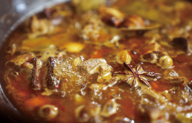 2、放入1勺料酒、半勺蒜末、1小块陈皮、1块八角、2片香叶、2个豆蔻、20粒花椒),再放入2勺麻婆豆腐酱炒匀。