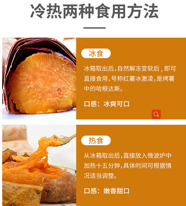 颠覆烤红薯只能热食的传统思维和习惯;“冰烤地瓜”可常温自然解冻或烤箱、微波后食用,外表微软而内心冰爽,轻轻掰开便立即释放出淡淡蜜糖焦香,入口清凉爽心、软糯香甜、湿润不干涩,可尽享冰淇淋一般的绵密细滑,在酷热难耐的夏日吃上一口甜糯绵密的“冰烤地瓜”,冰凉爽滑,凉彻心扉,天然美味让人欲罢不能。
