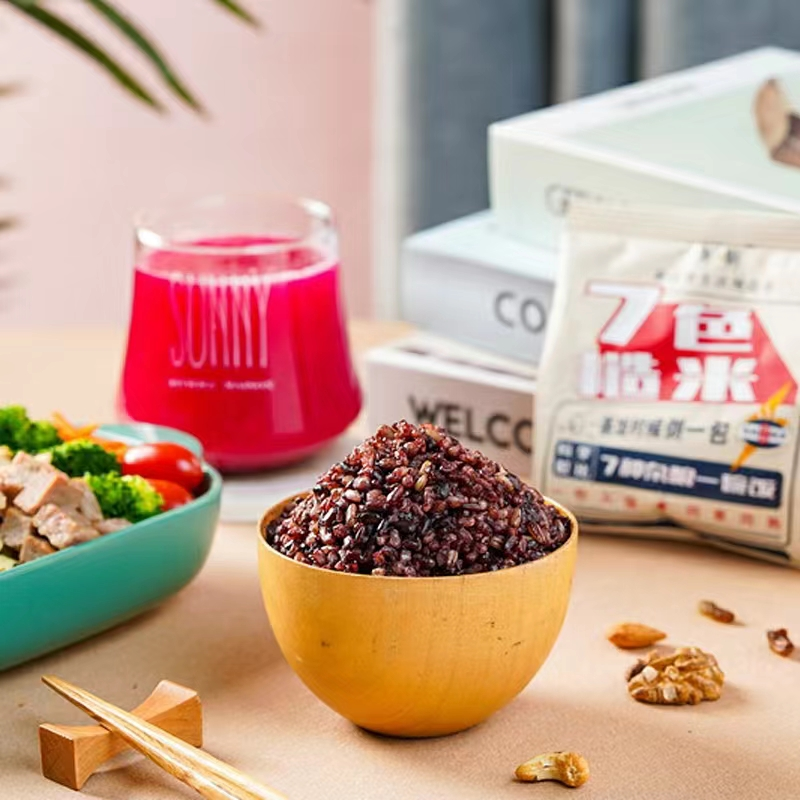 七色糙米,它的GI值(血糖生成指数)比米饭低27%,腹感更强,比大米更健康。