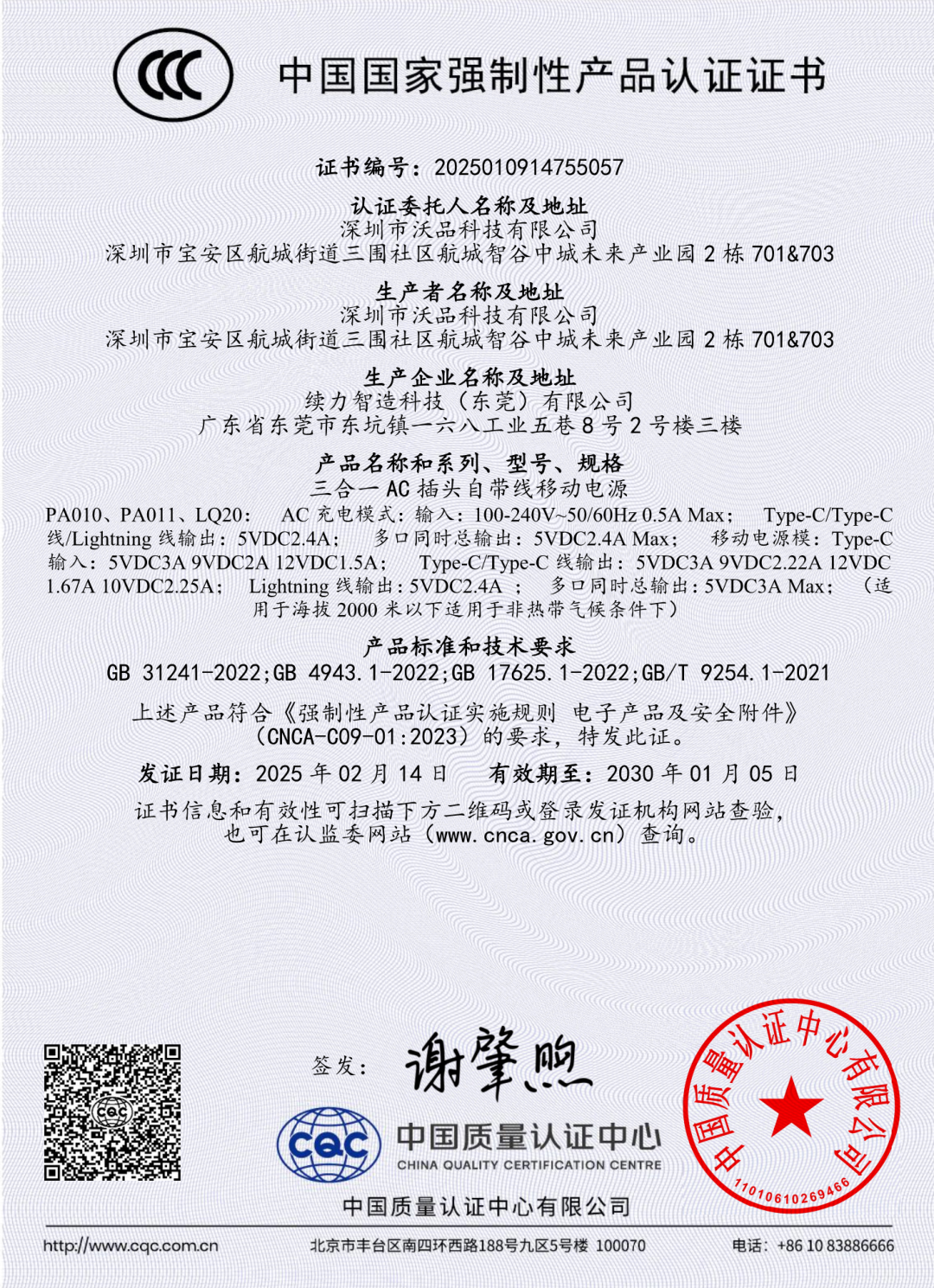 沃品充电宝,全线产品均通过国家强制性产品认证(3C),标识清晰齐全。