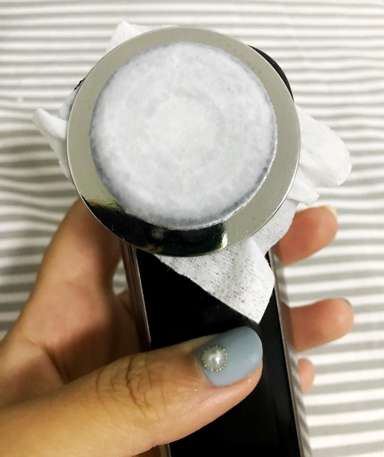 第❶步:清洁模式,CLEAN,使用时间三分钟,这个功能是深层温热,清除毛孔深处的污垢,先把上面有磁性的铁扣拿下来,圆环和机子是磁铁吸附的,把化妆棉放上去,扣起来,
