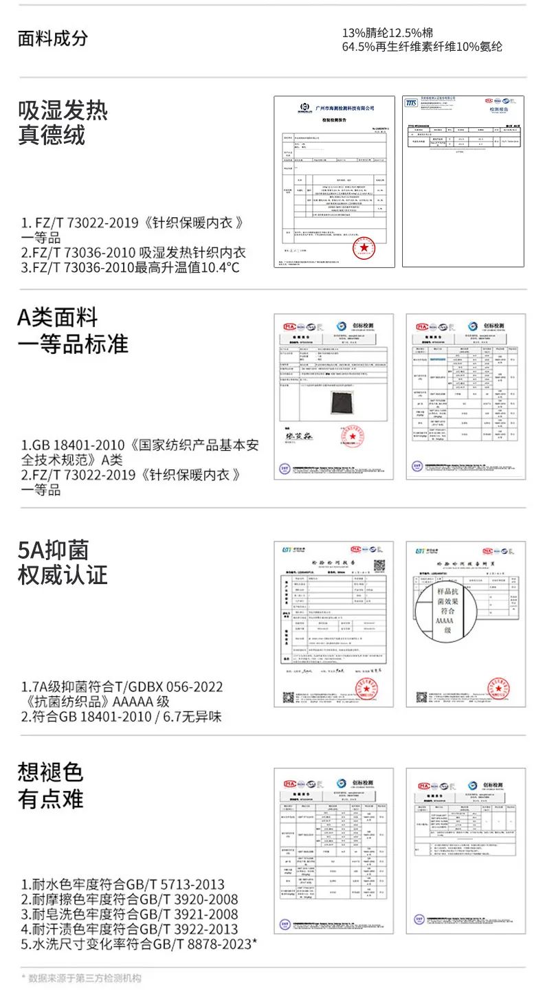 笙观相沐经过4份报告检测!吸湿、发热、A级面料一等品、5A抑yi菌、以及褪色率等