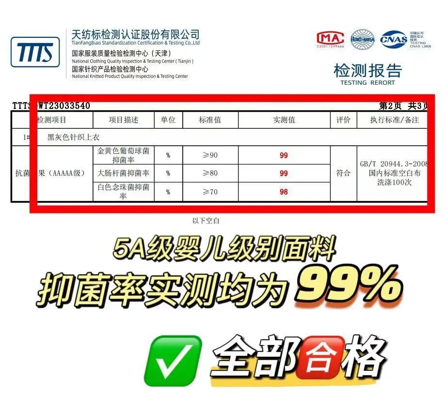 其中,检测里光5A级面料里测试的yi菌率,3个常见菌yi菌率都是99%!