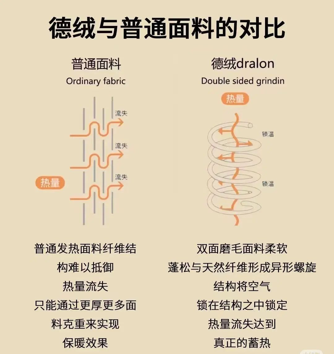 德绒特殊的“狗骨型异型横截面纤维结构”,与天*然纤维形成异形螺旋结构,将空气锁在结构之中,锁定热量流失,达到真的蓄热