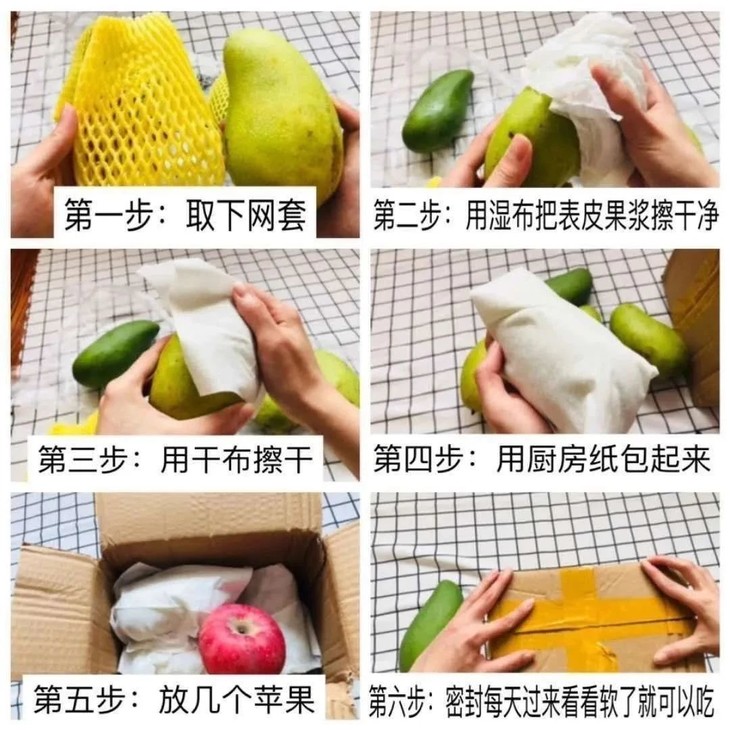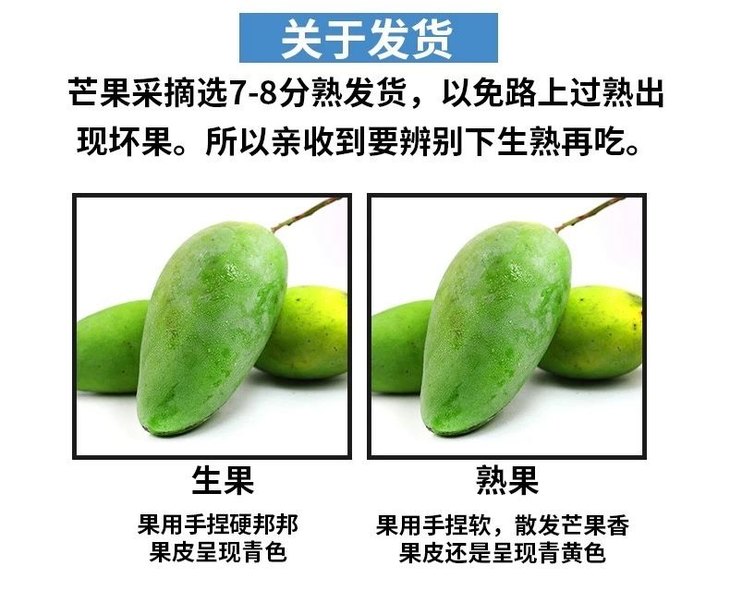2.我们的贵妃芒在树上7-8成熟时摘下,不打催熟不放药,收到货需要擦拭干净,用黑色袋子或者箱子密封放温度高地方,放上3-5天就会自然熟透,熟透的时候,果子会有香气变黄,香味浓郁,口感也正合适,完全是其他品种的芒果比拟不了的。