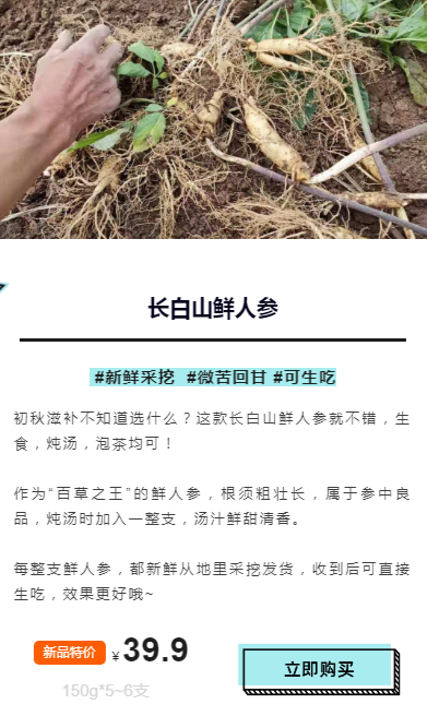 本周有:比手掌小的苹果、黑土豆、湘潭莲子、长白山鲜人参、食养煲汤料、流心榴莲饼