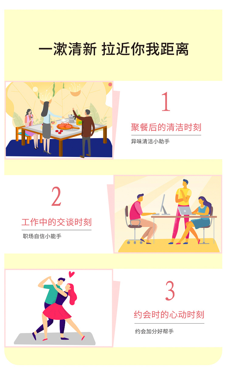 餐后不方便刷牙的情况下使用,以及其他有口气管理需要的情况下使用。
