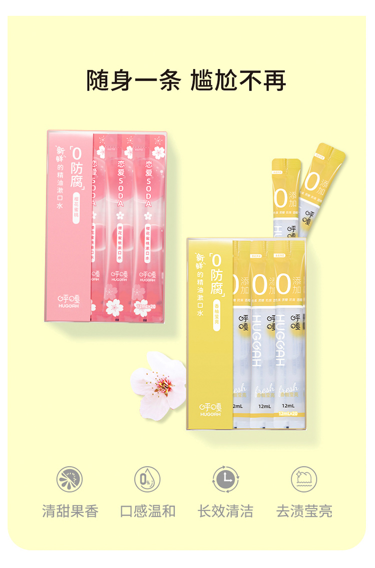 呼嘎漱口水有条装独立包装,方便携带,放进口袋、化妆包、背包都毫无压力,是出差、旅行、约会、面试必备神器。