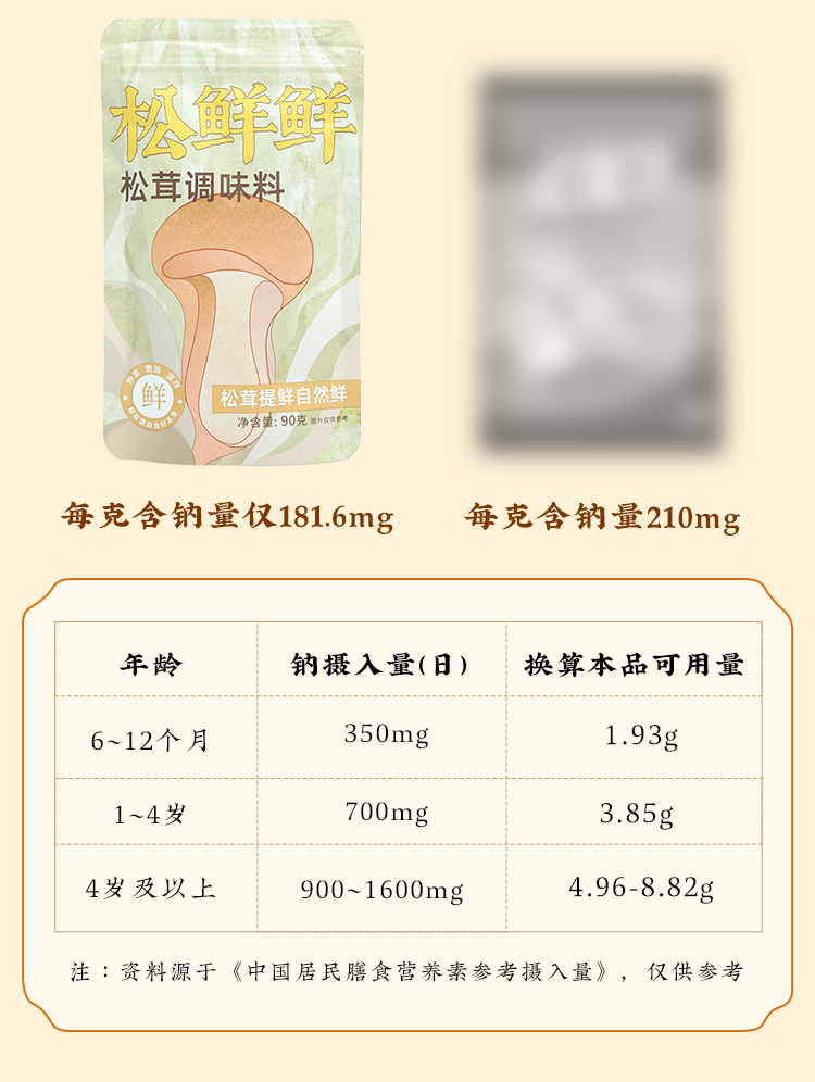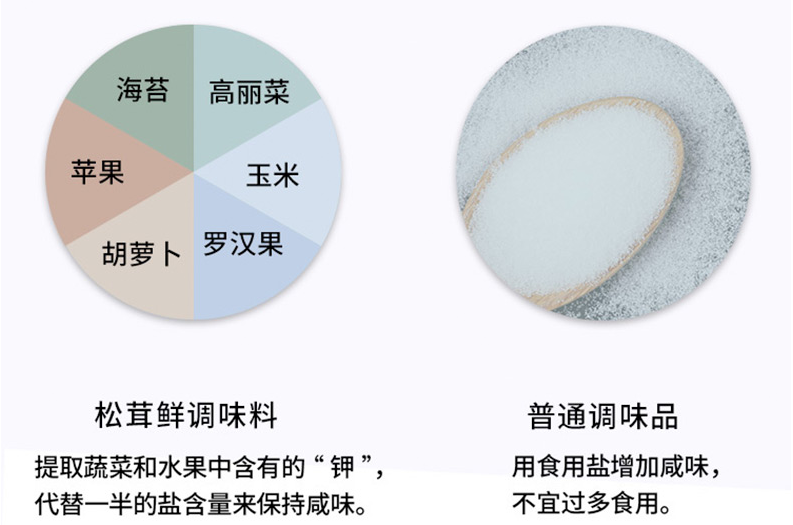 在咸味上,通过提取蔬菜和水果中含有的“钾”,钾含量部分代替钠含量维持咸味,减少盐用量。相较于普通调味品,松茸鲜调味料的钠含量较低,每克钠含量仅181.6mg。