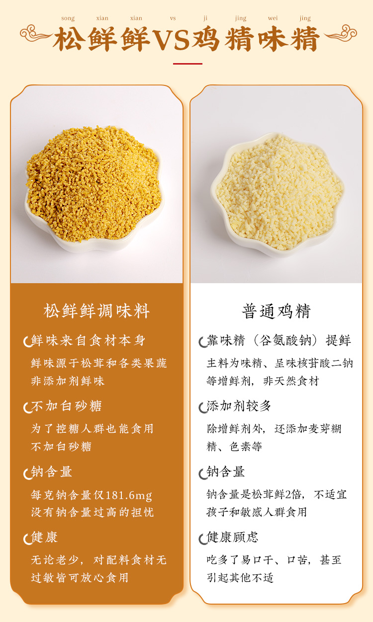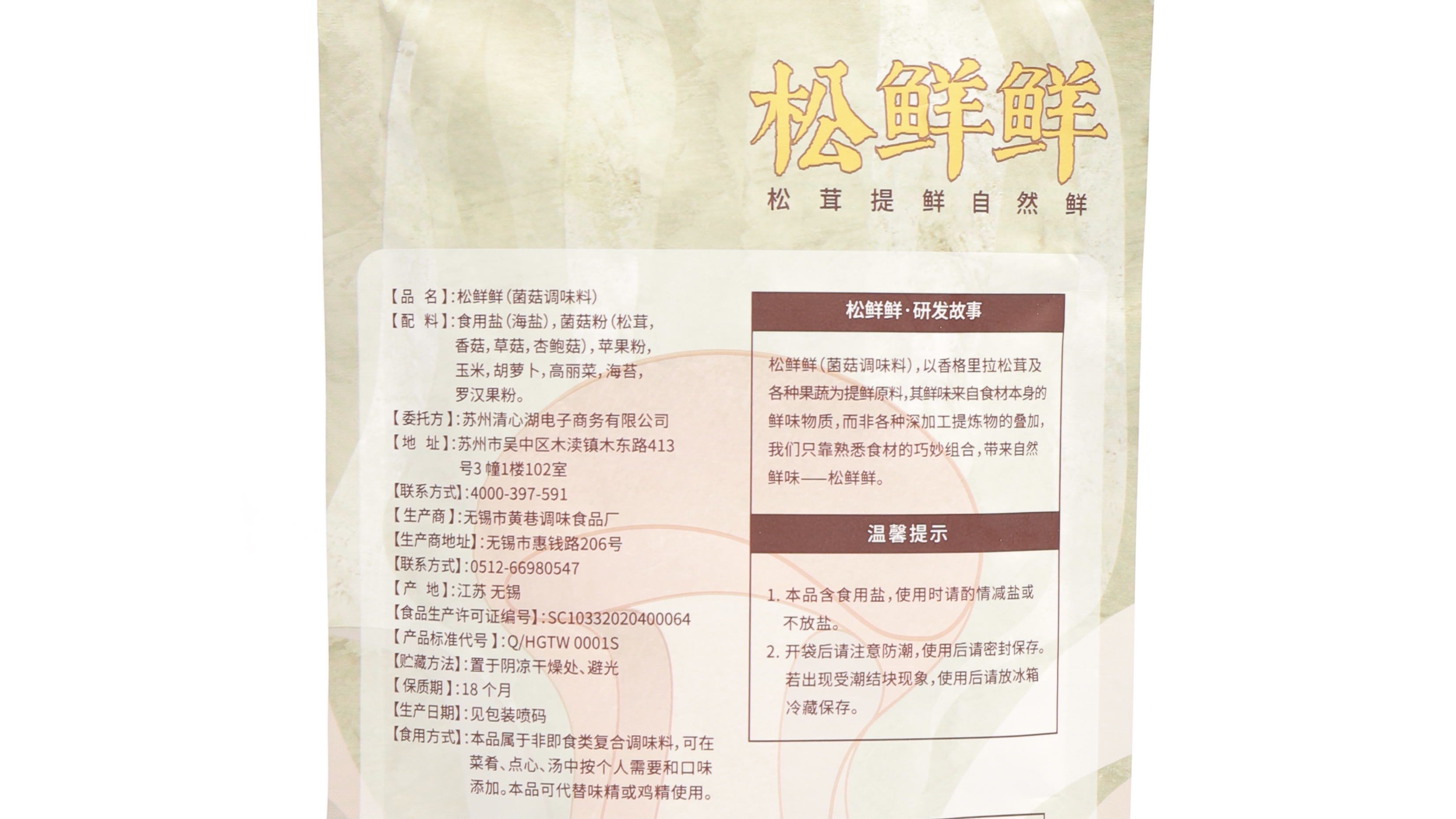 松鲜鲜,一个让孩子食欲大开的松茸调味料,宝贝能放心吃的健康调味料。主要以香格里拉松茸及各种果蔬为提鲜原料,全自然食材,无各种添加剂,无超标钠摄入量,无非提取物鲜味,既能在清淡食物基础上增鲜,抵消孩子不爱吃绿色蔬菜的抵触情绪,爱上吃饭、主动添饭,补给营养,补充能量;又能帮助在辅食中提鲜,增加孩子食欲,培养清淡的饮食习惯;同时呵护孩子脾胃,增长身体,健康成长。
