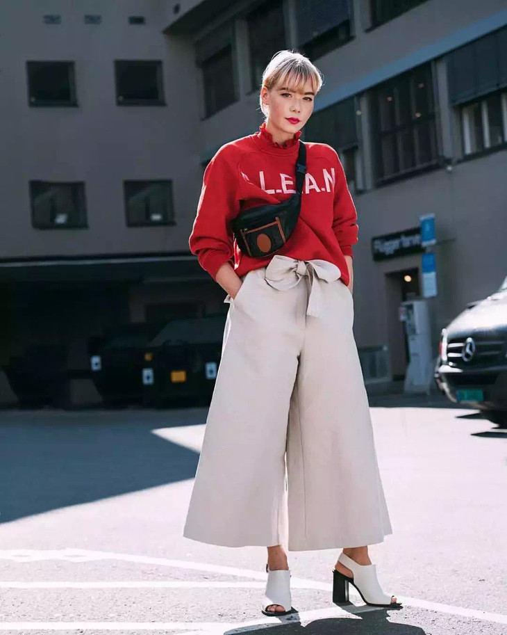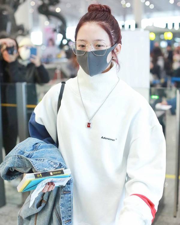 如果喜欢的卫衣领口不够大,可以利用饰品如中长的项链、太阳镜,配件如斜跨包包、丝巾等做视觉上的切割,人为打造“V或X”领效果,避免大块面积出现在胸前。
