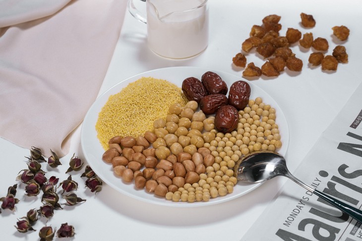 先将鹰嘴豆、黄豆、花生、小米洗净备用,红枣清洗去核;