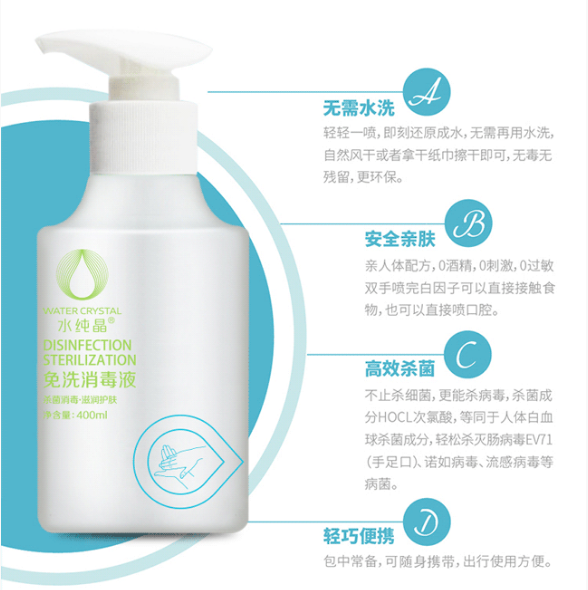 而水纯晶的免洗消毒液正是解决了这件事,它的免就是免水,没有水也可以消毒,甚至消毒抑菌力度更强