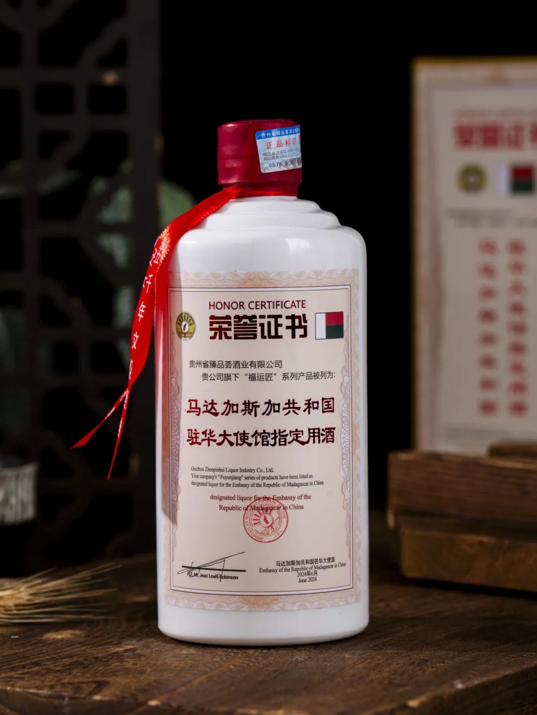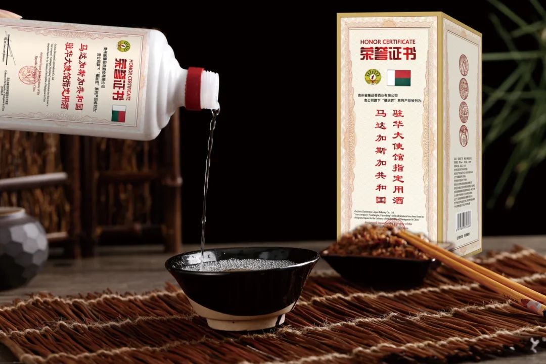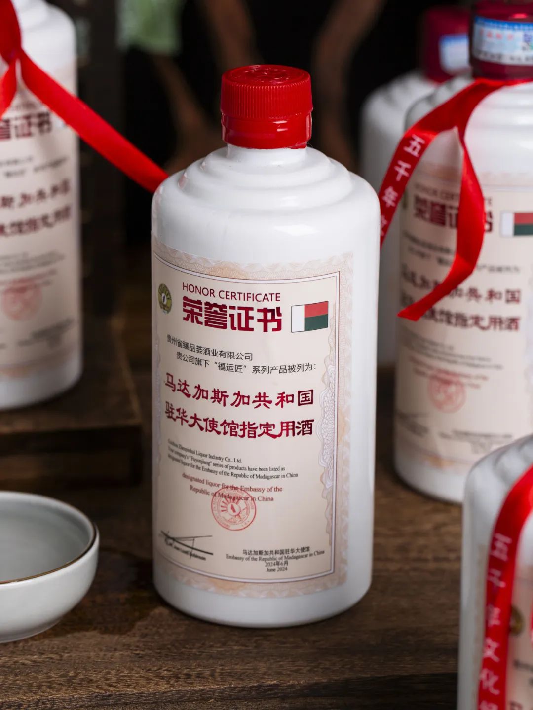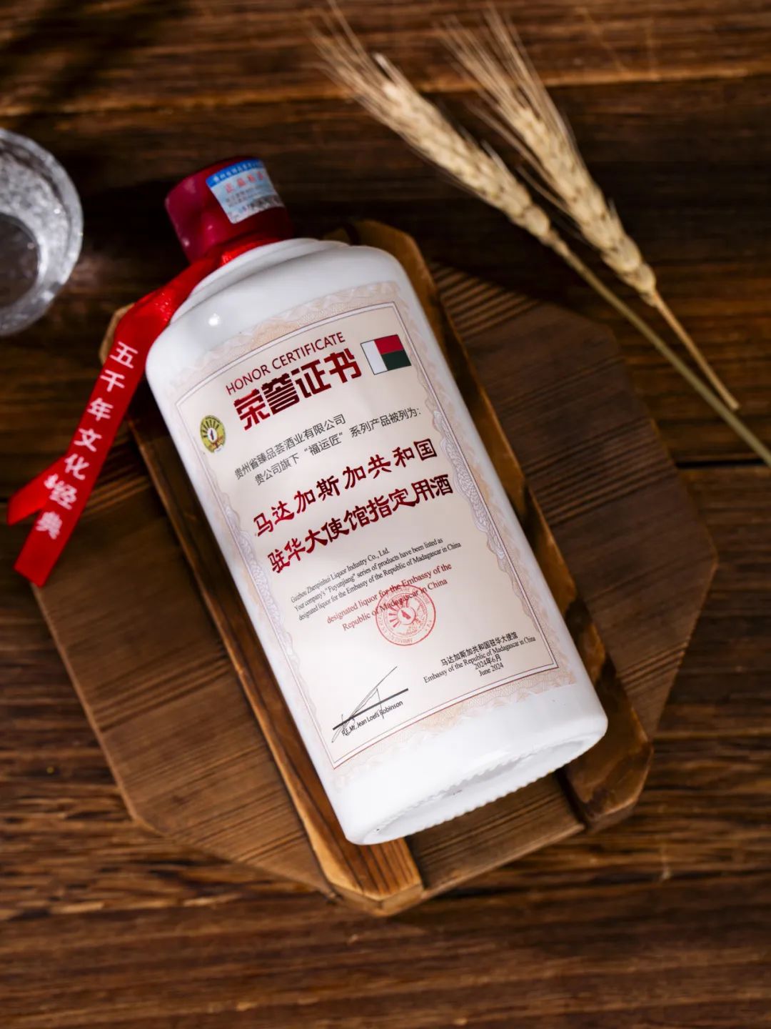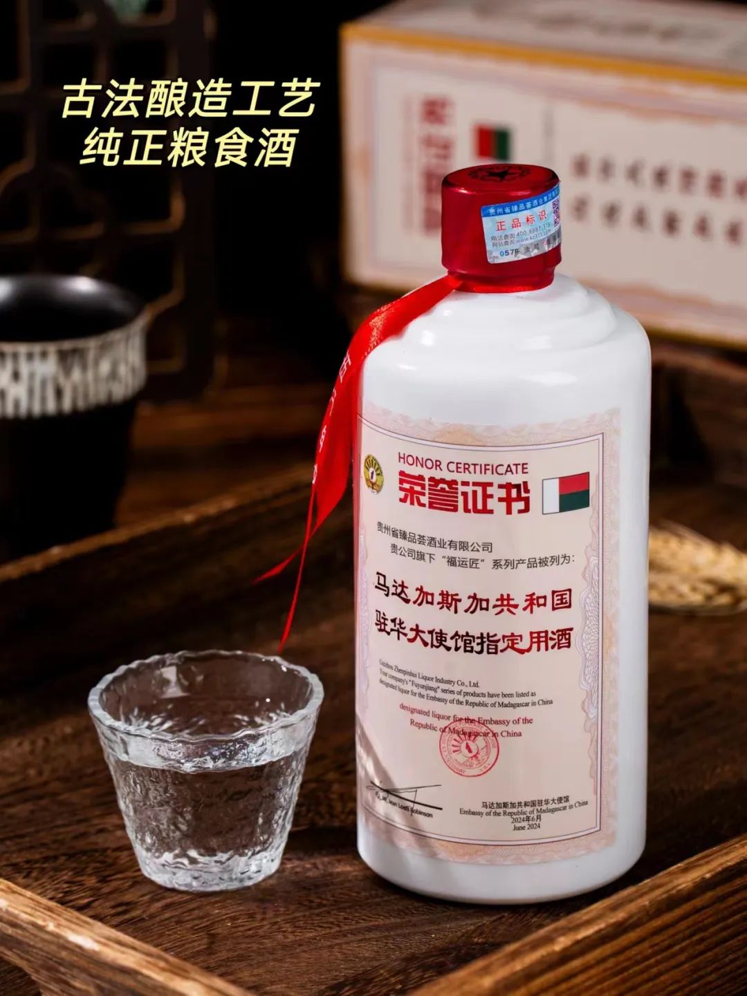 马达加斯加驻华大使馆指定用酒福运匠酒,来自贵州臻品荟酒业有限公司旗下,茅台镇出品,代代相传的酿造技艺,那叫一个地道。