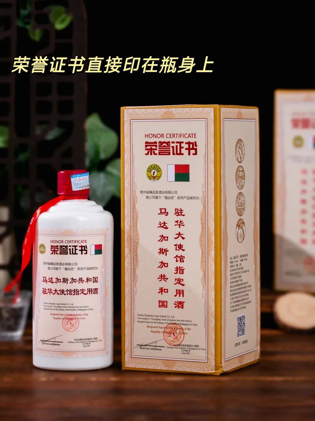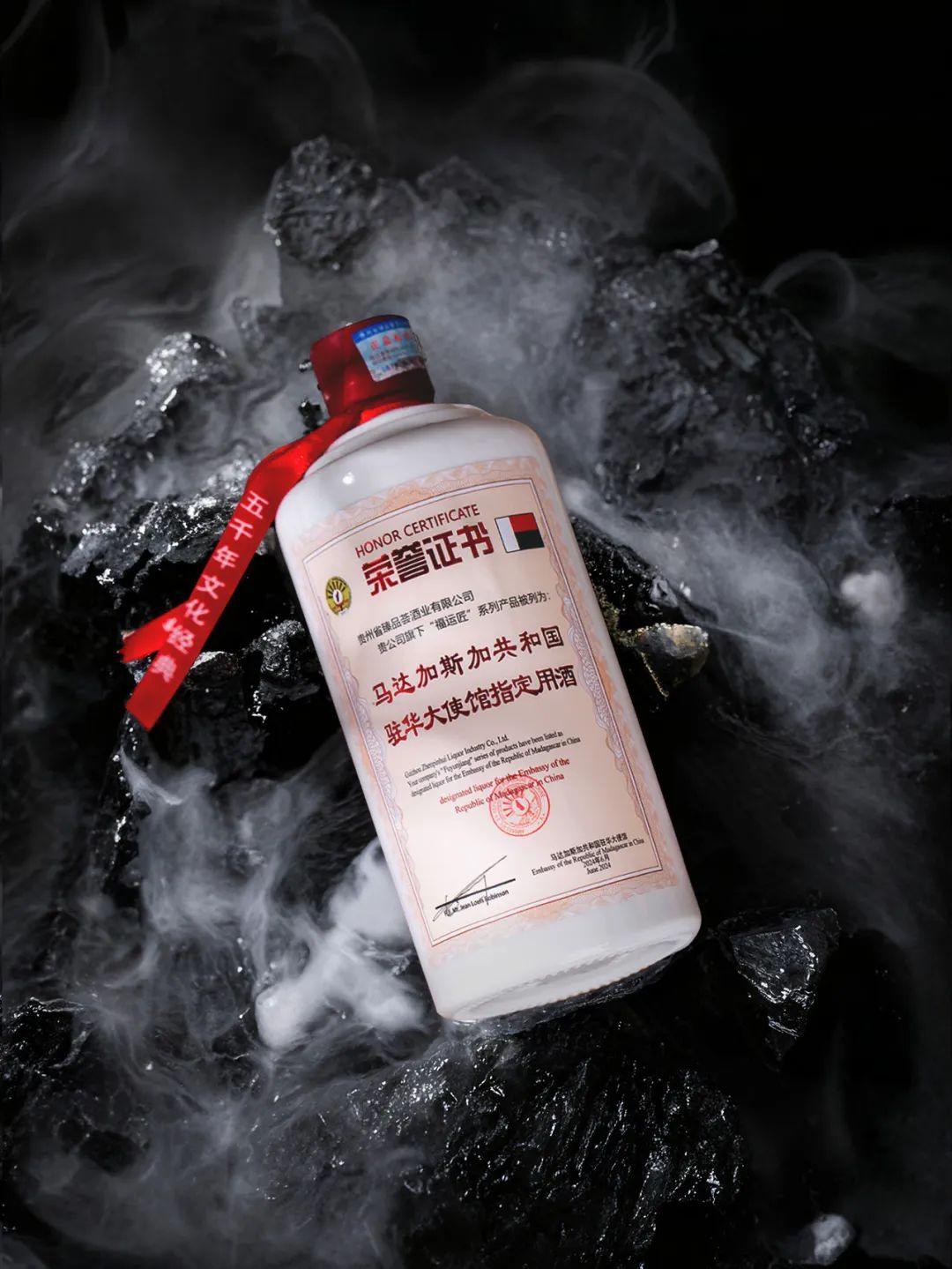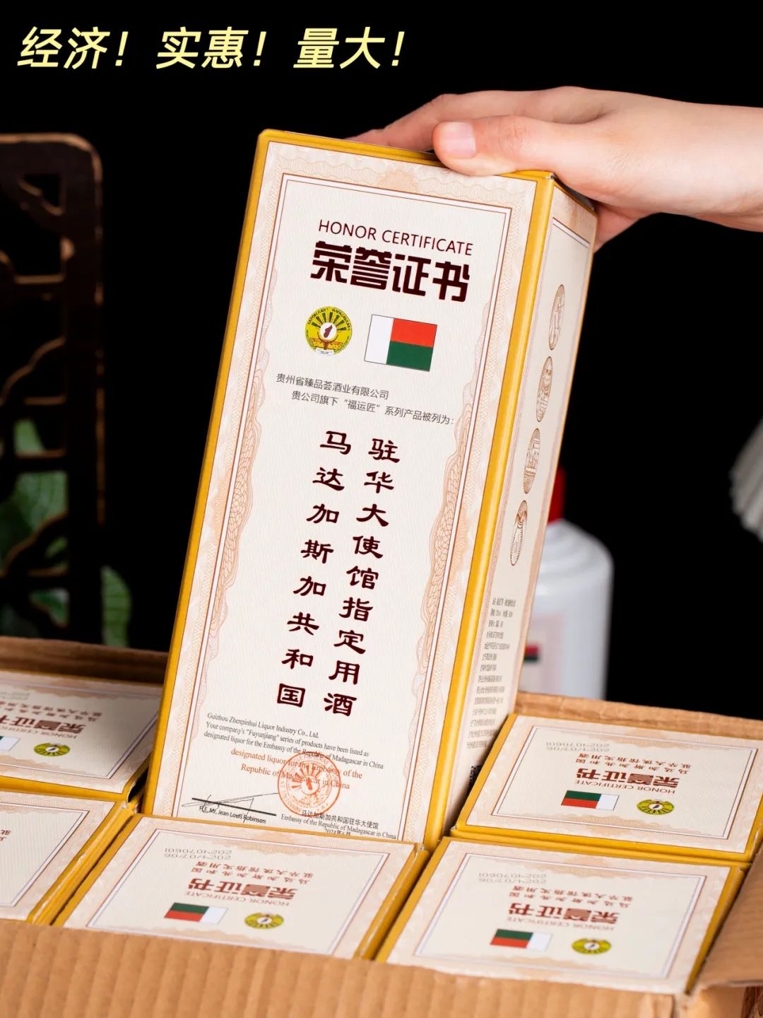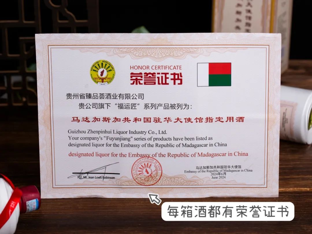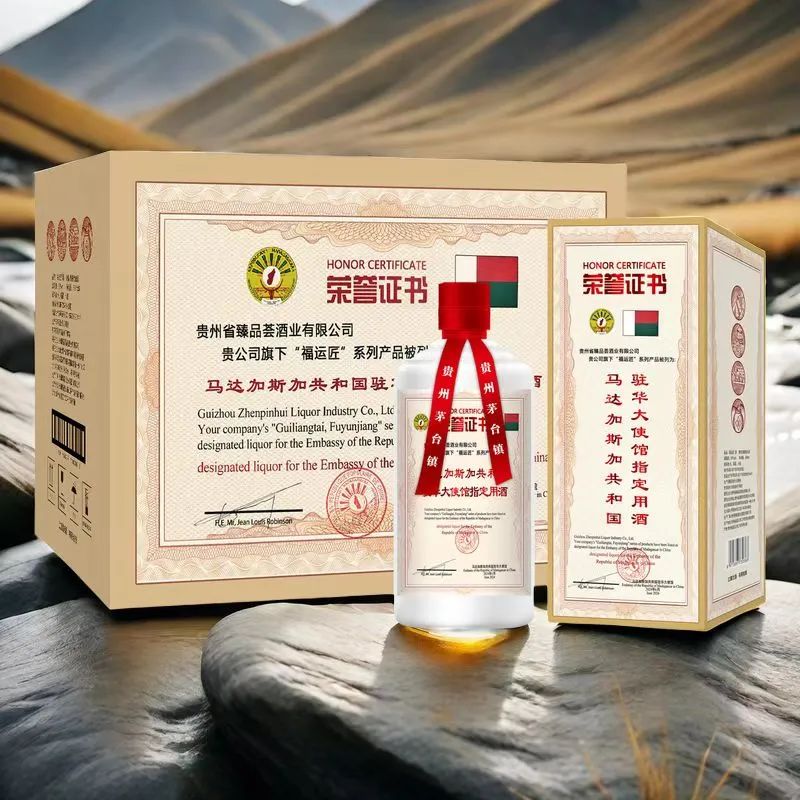 马达加斯加驻华大使馆指定用酒福运匠酒,来自贵州臻品荟酒业有限公司旗下,茅台镇出品,代代相传的酿造技艺,那叫一个地道。