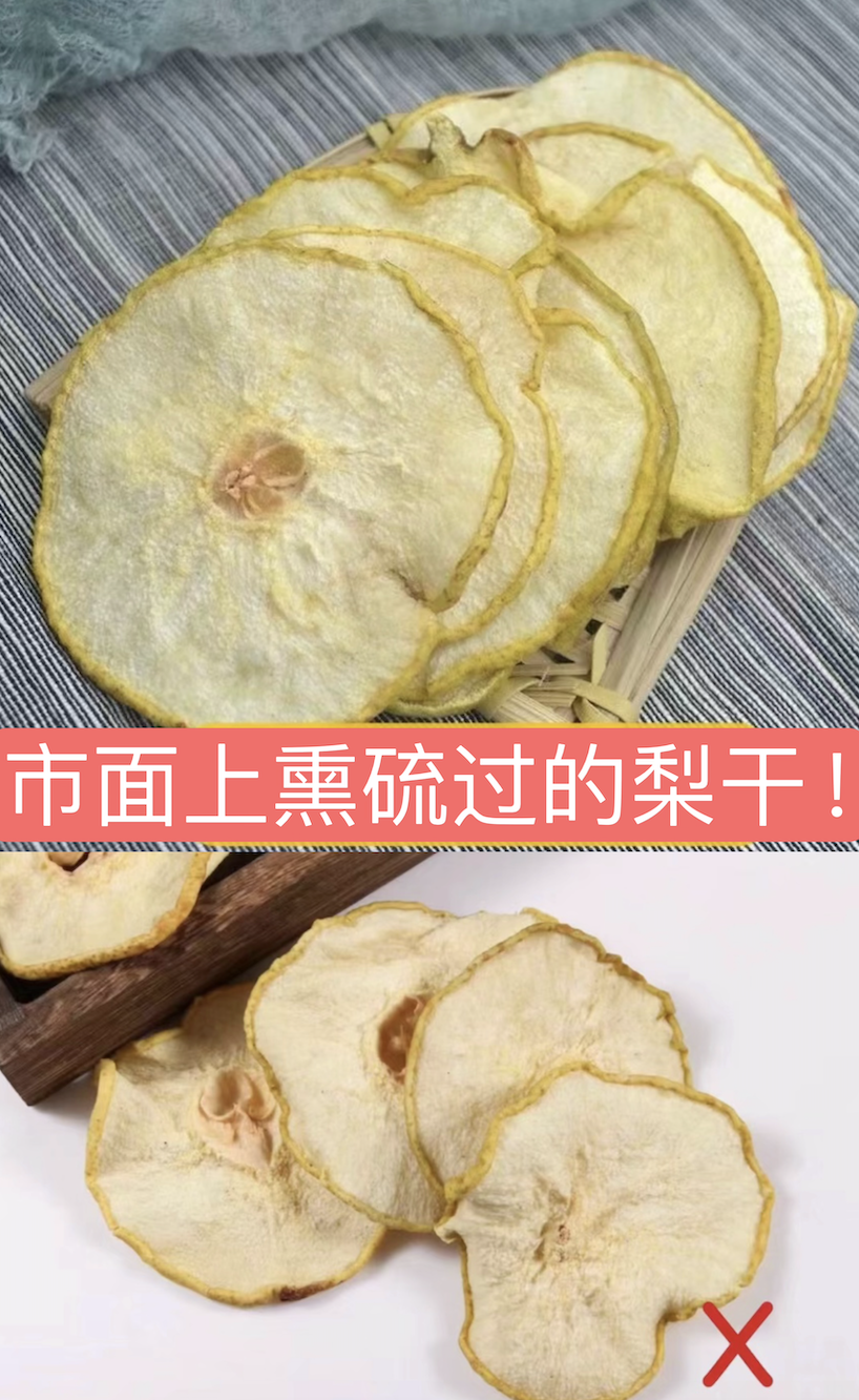 市面上很多无良商家,为了缩短加工时间,降低成本,采用烂梨、破损的梨制作梨干,并且使用硫磺熏制工艺。