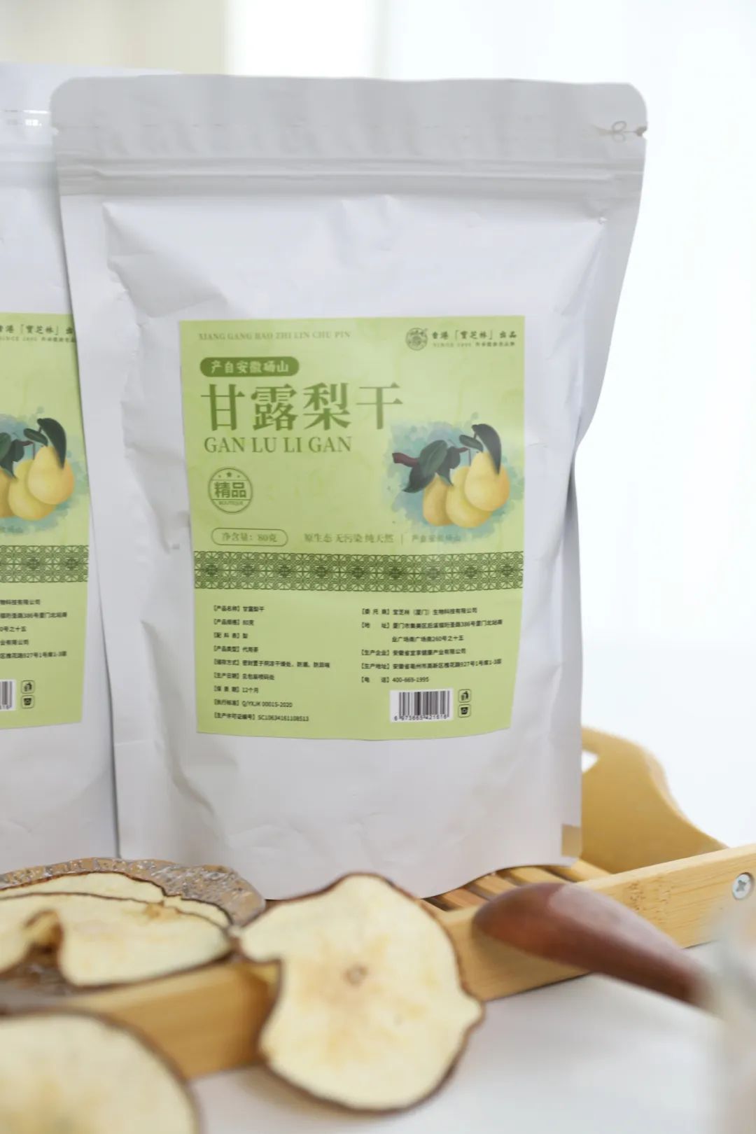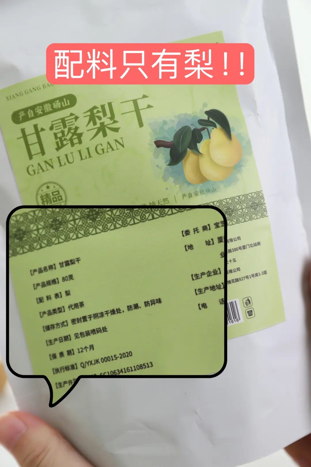 宝芝林甘露梨干的配料表干干净净的,除了梨,别无其他。无防腐剂、无香精、无任何添加剂,确保你吃进去的每一口都是天然食材,安全健康,即便是孩子也能让他放心吃。