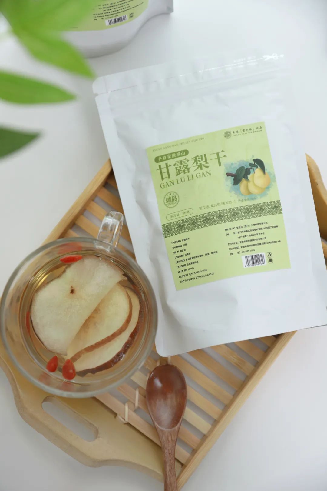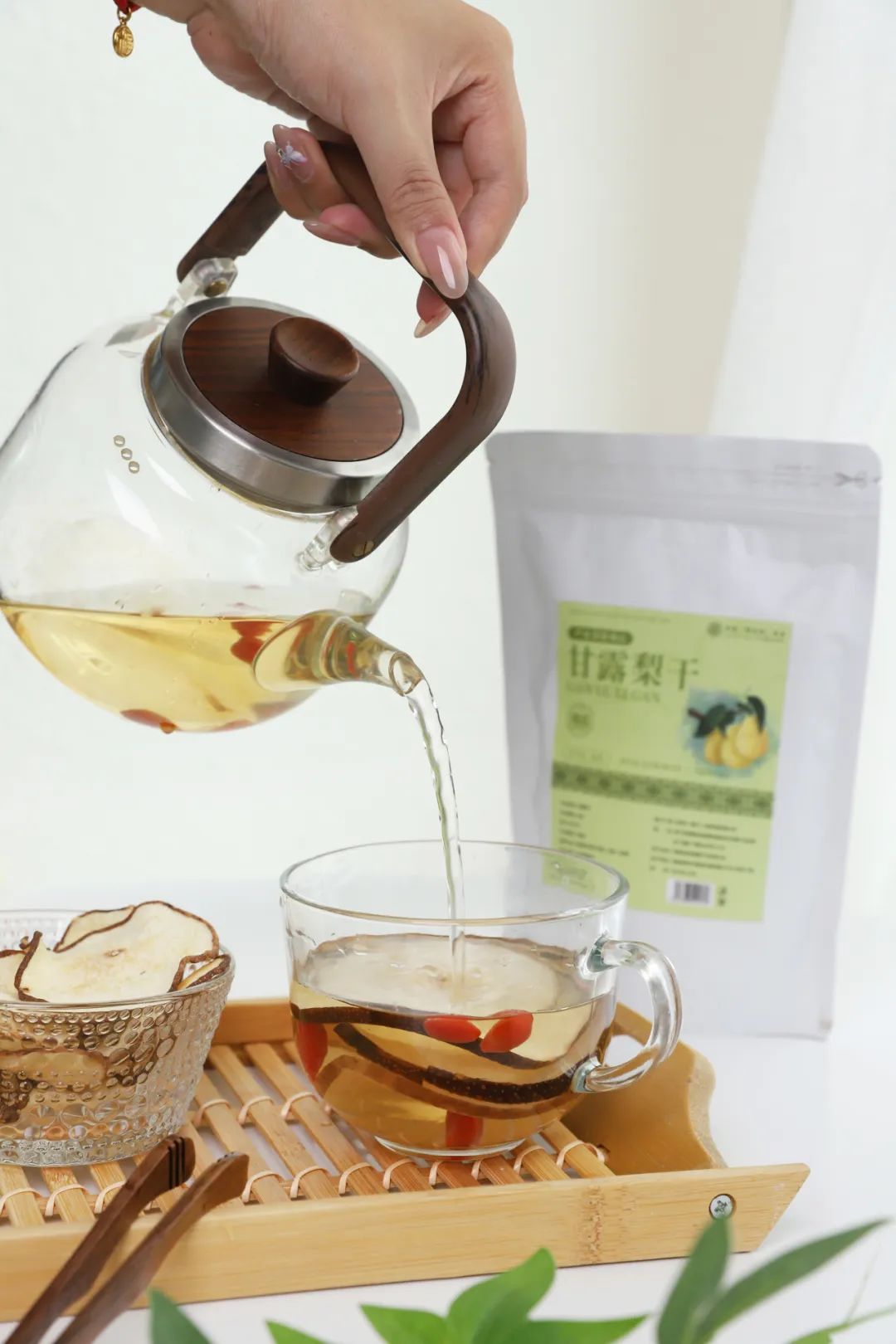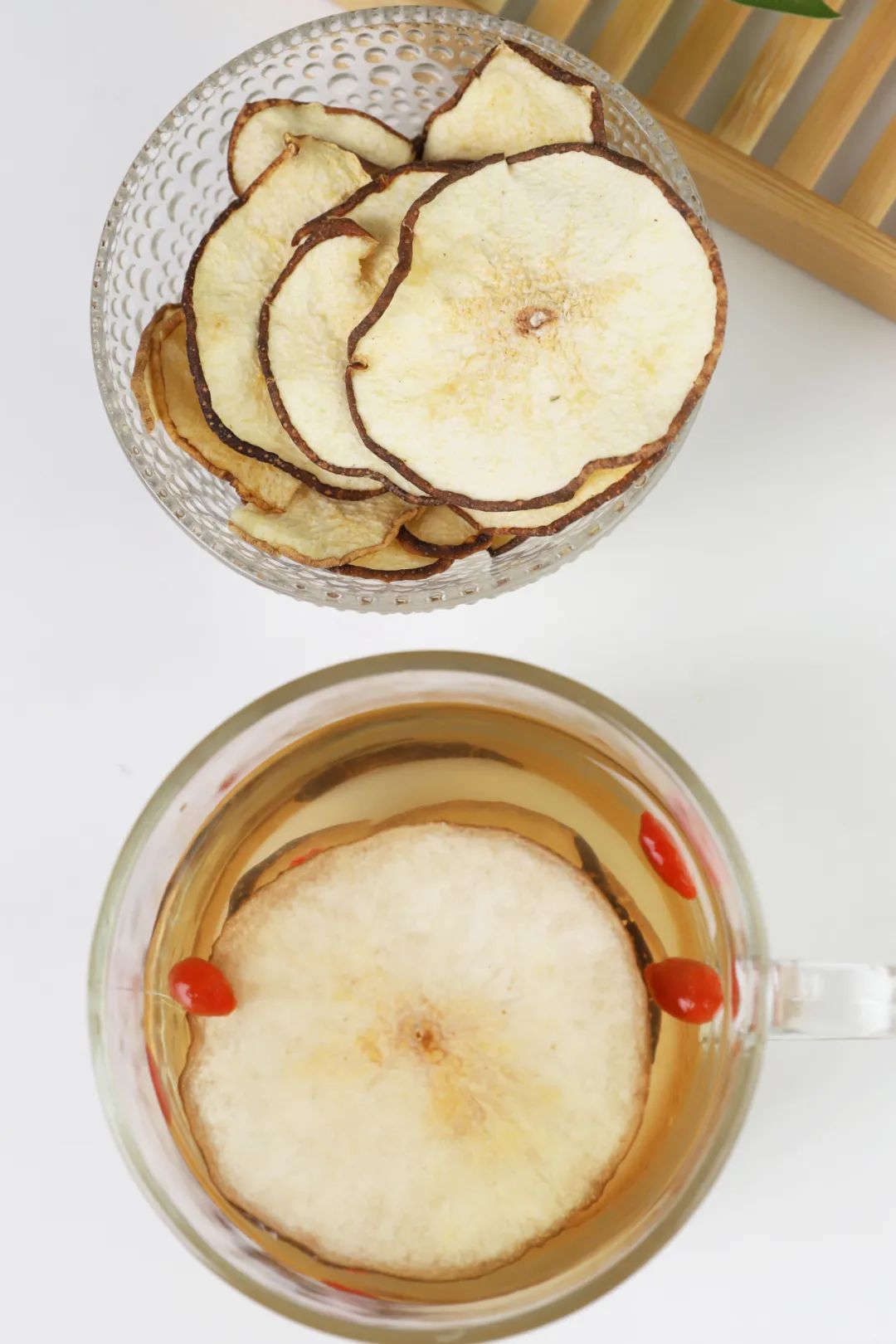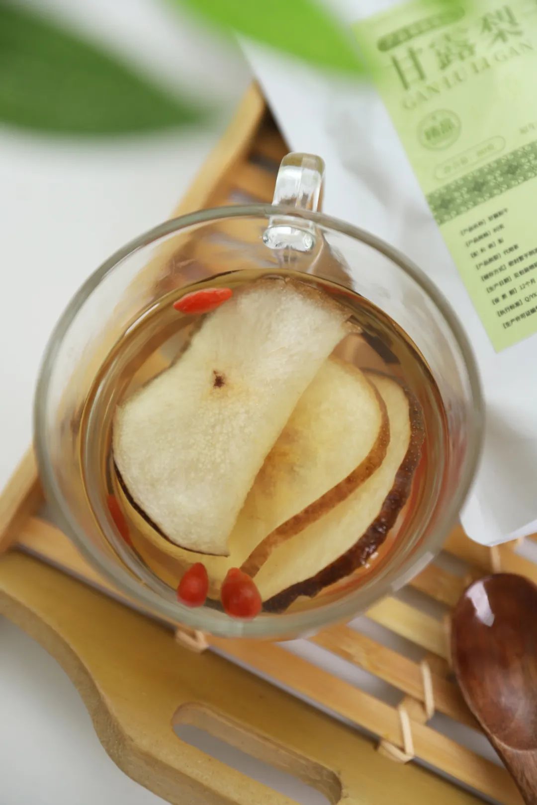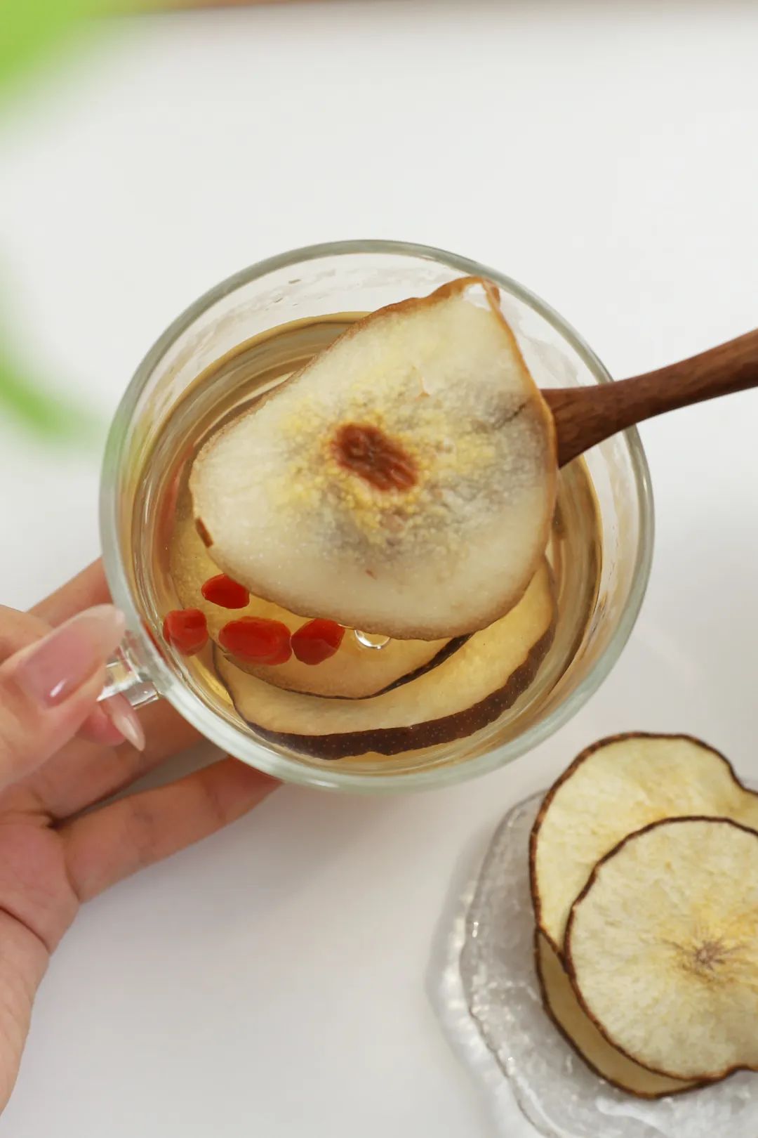 如果觉得只有梨干,口味单调,也可以搭配其他食材一起,如绿茶、红枣、枸杞、冰糖等,做成营养健康的养生糖水。