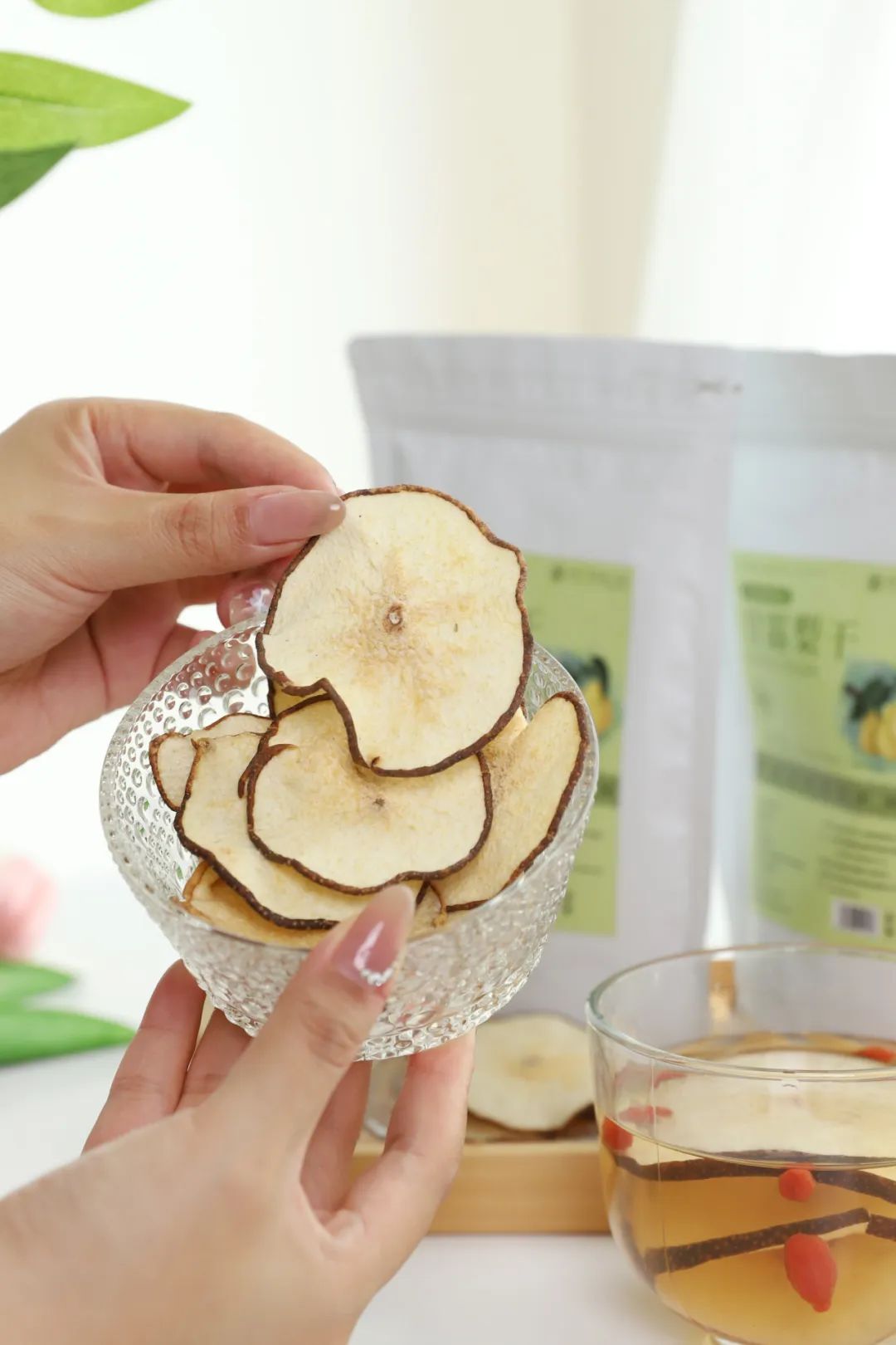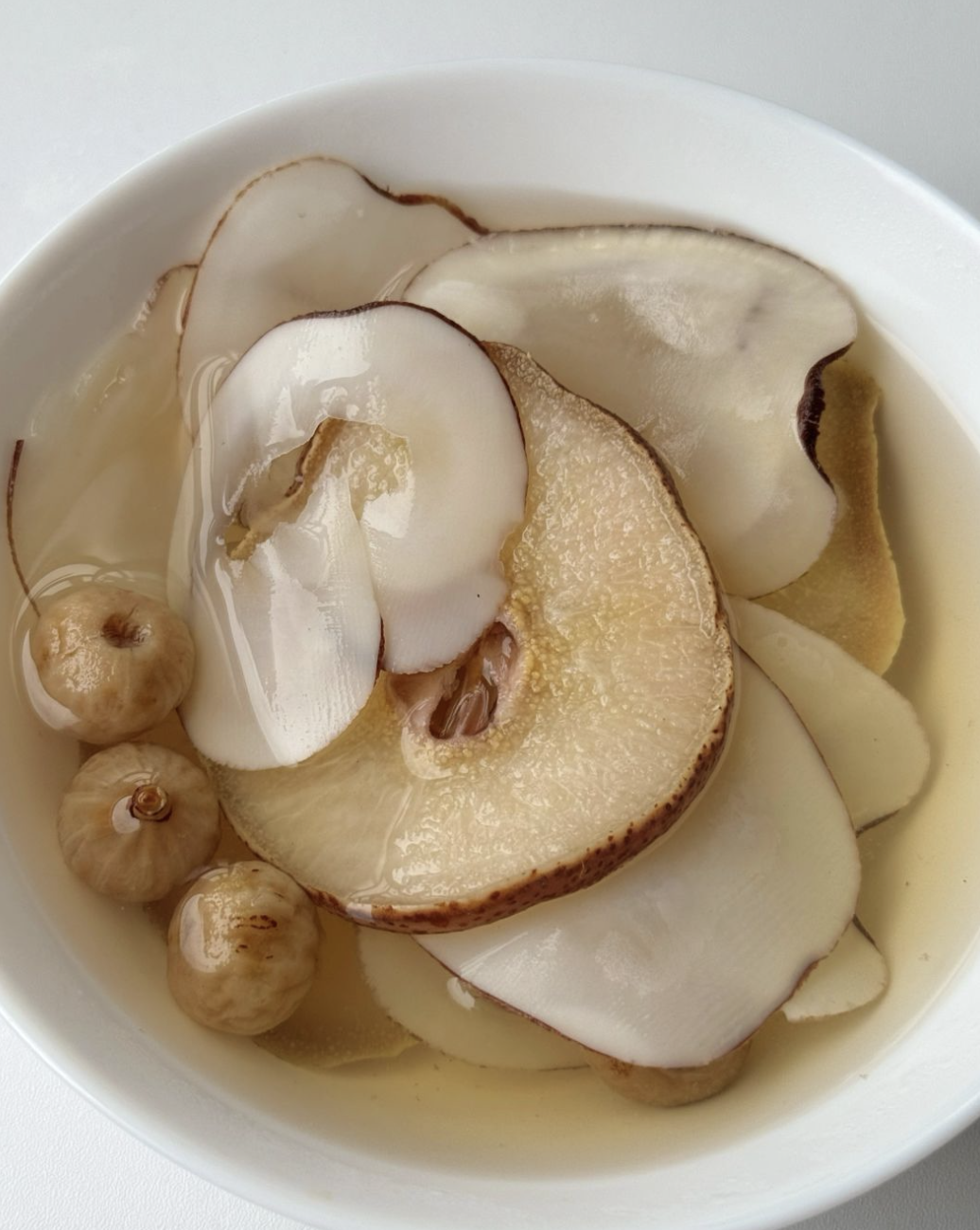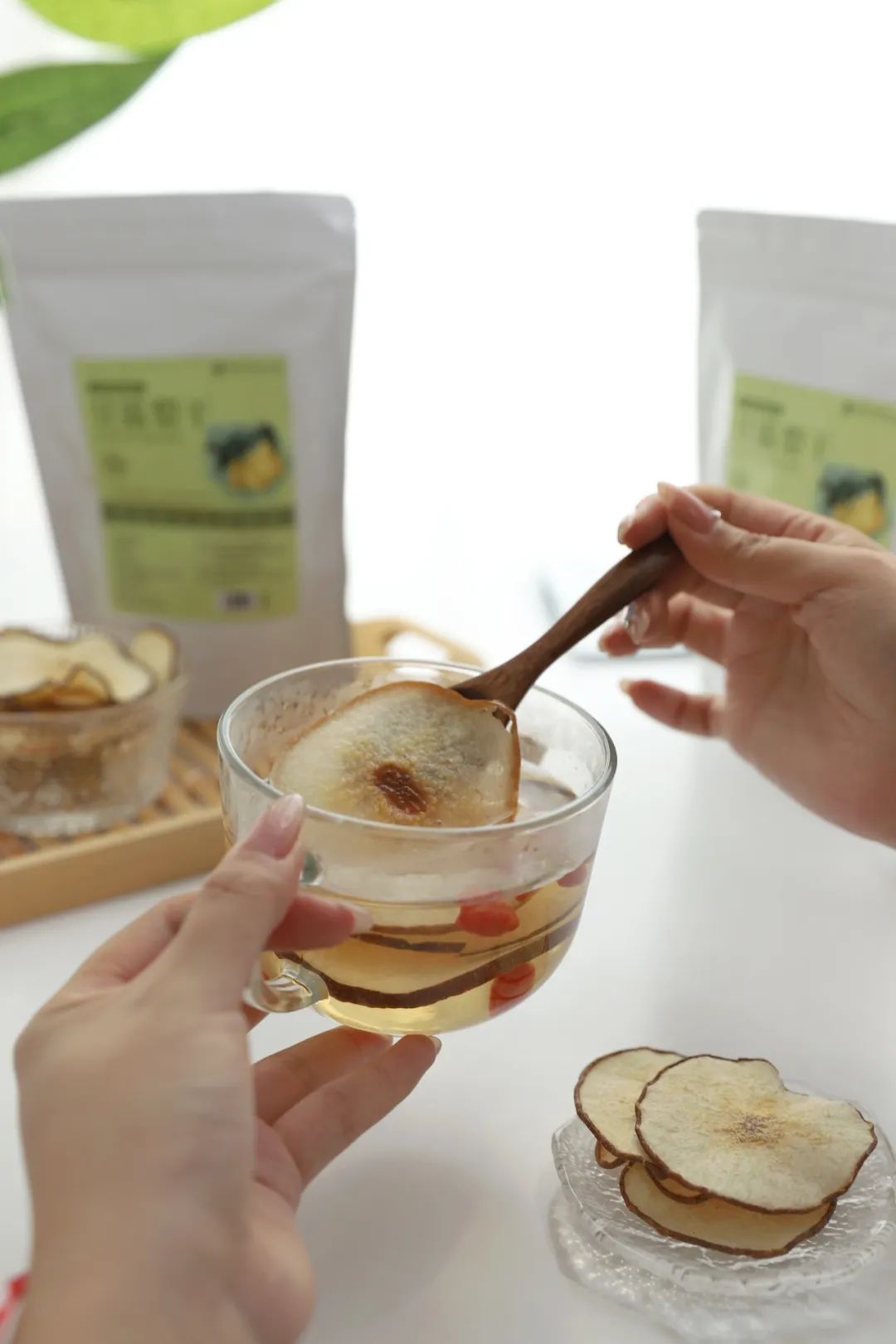 想喝的时候取几片,煮水即可。白开水变得清甜有梨香,甜丝丝的,水润润的,就连不爱喝水的人都能一天喝够8杯水。