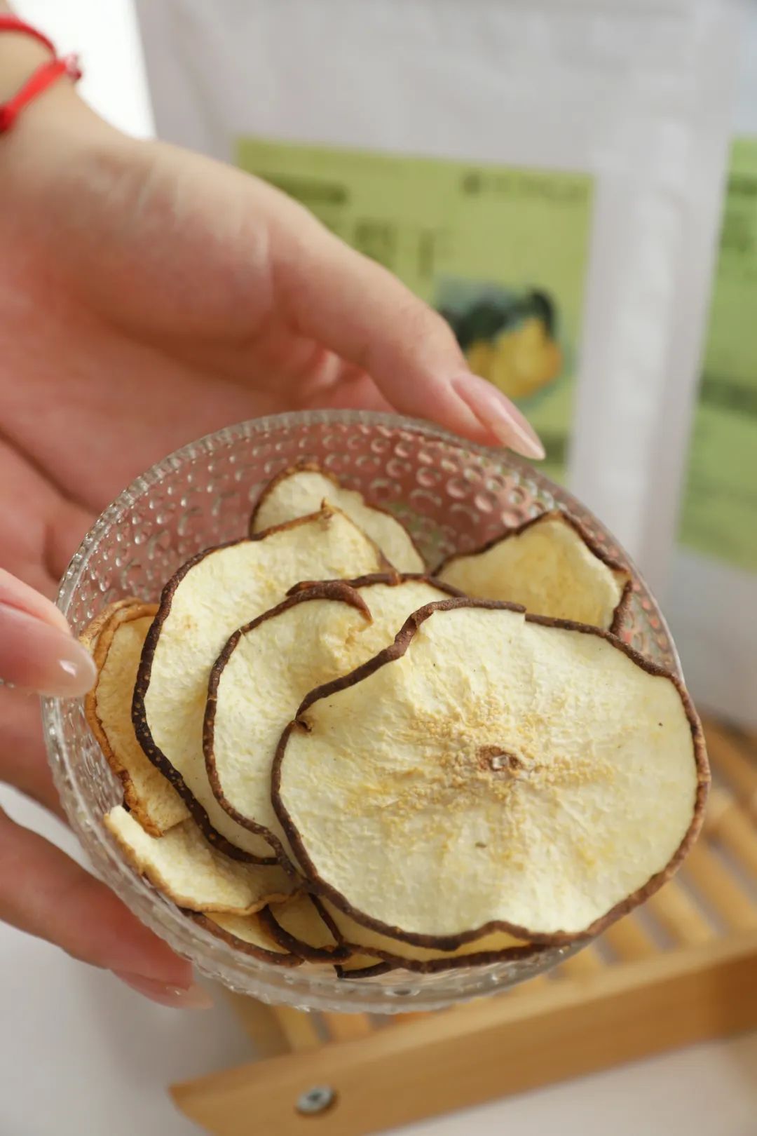即使经过烘干,略有缩水,一个梨片也足有半个手掌那么大。