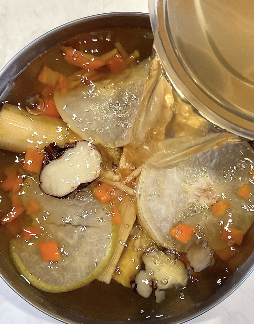 像我这样用热水把它冲泡开,空气中能闻到淡淡的梨子香,汤色微黄透亮,入口清甜,下喉生润。当然也可以用来煮茶、熬汤,或是直接干吃,享受它的原滋原味~