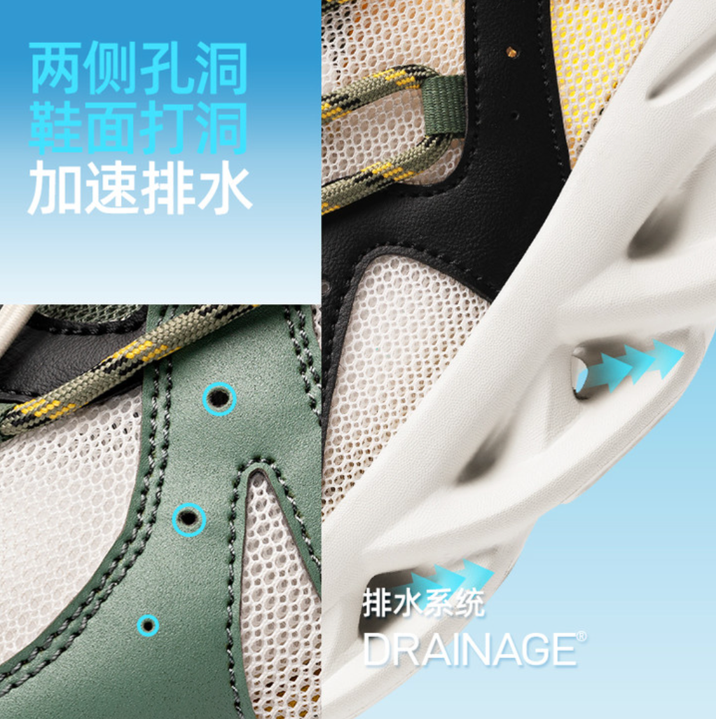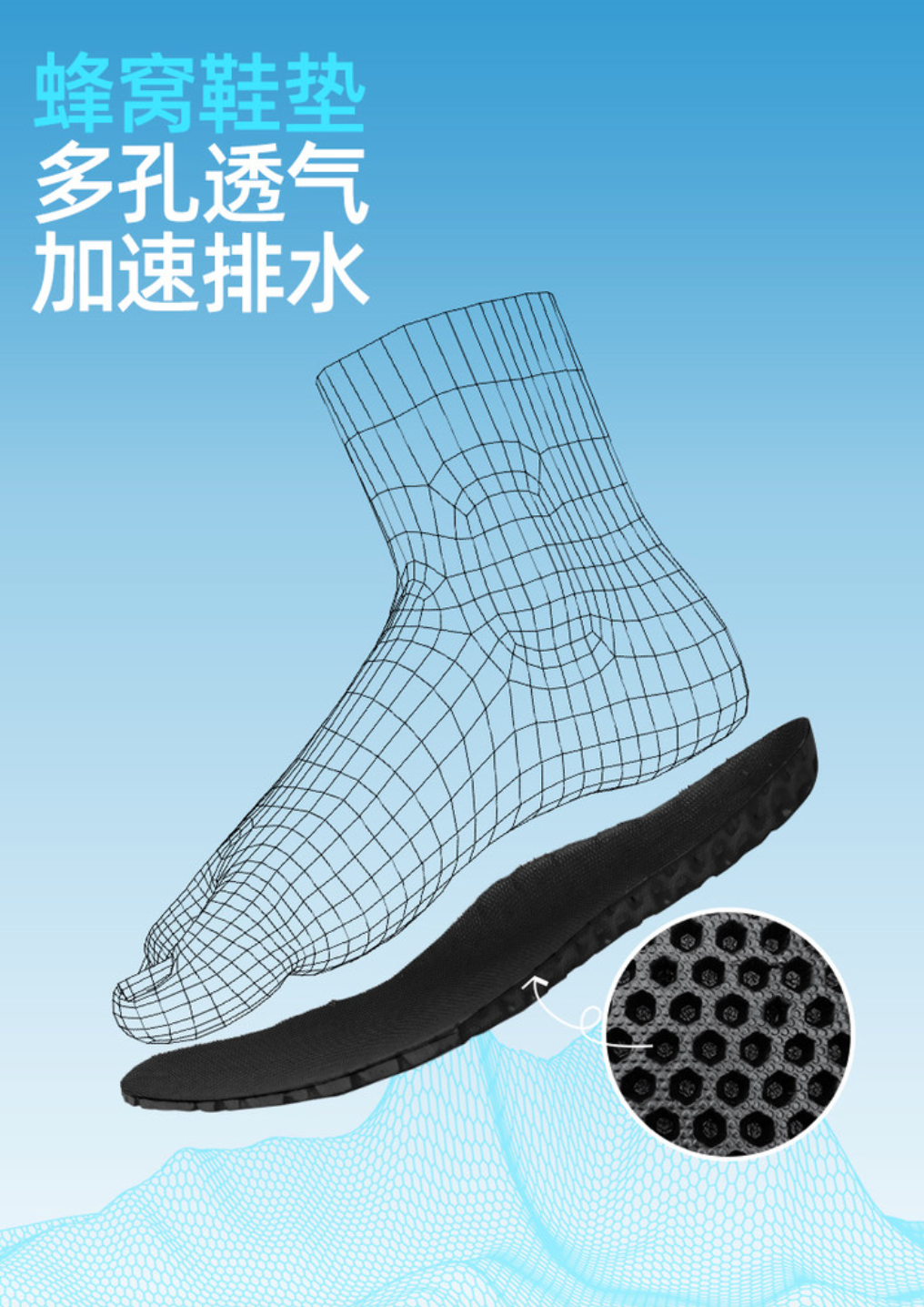 搭配多孔蜂窝鞋垫,不仅加速排水,脚丫子也仿佛会“呼吸”!