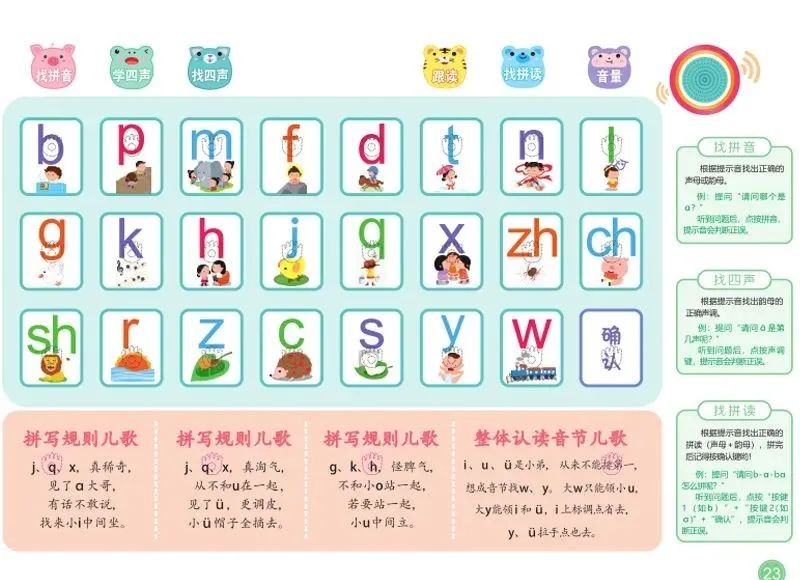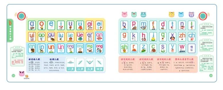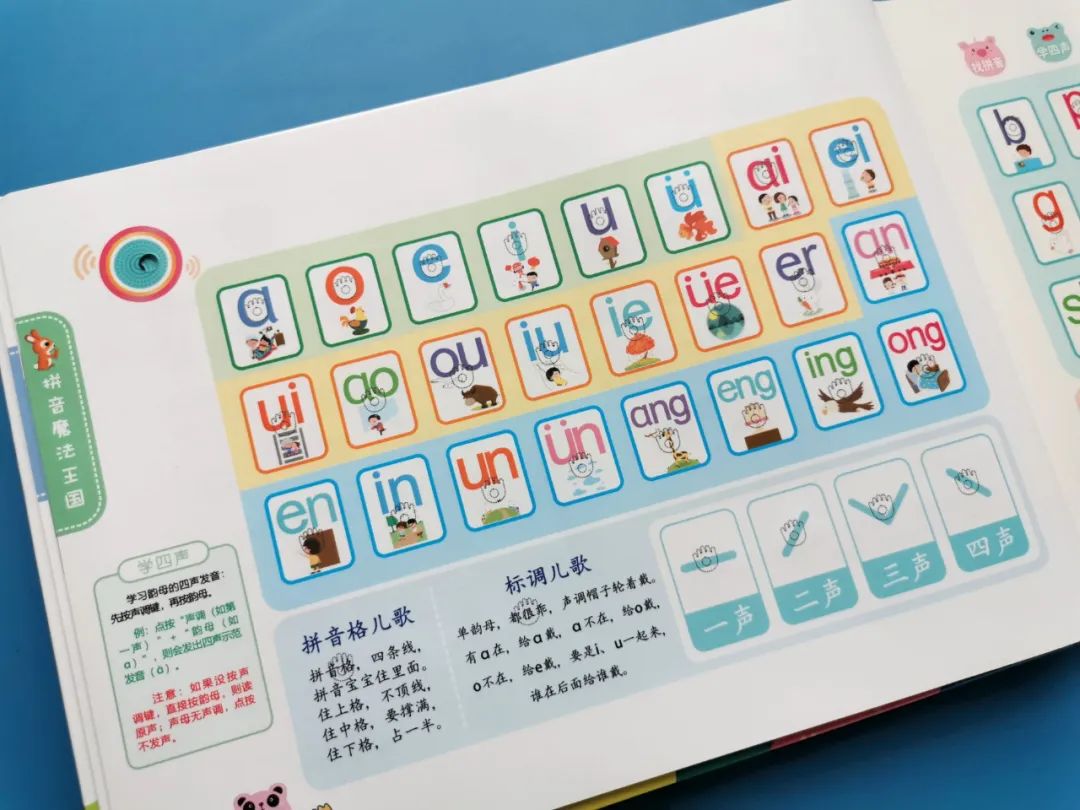 这《会说话的魔法拼音》囊括了6个单韵母,23个声母,12个复韵母,6个鼻韵母,16个整体认读音节,以及声调和拼读规律的学习。不仅这样,还延伸了汉字、词语的学习。