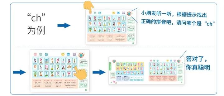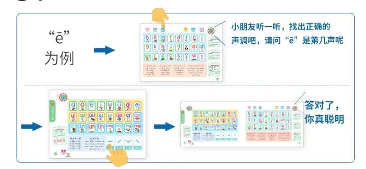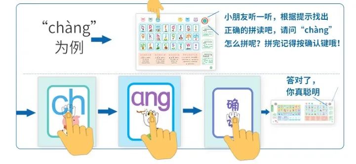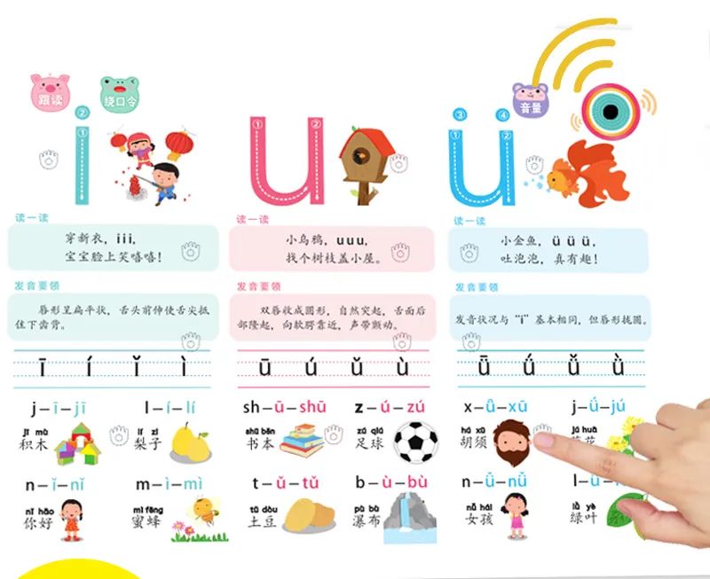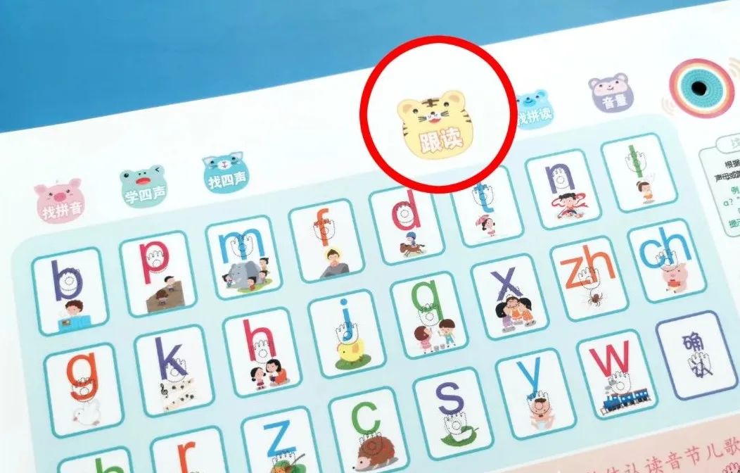 说:让孩子跟着发声板,开口进行跟读。通过反复念读,加深孩子的记忆。
