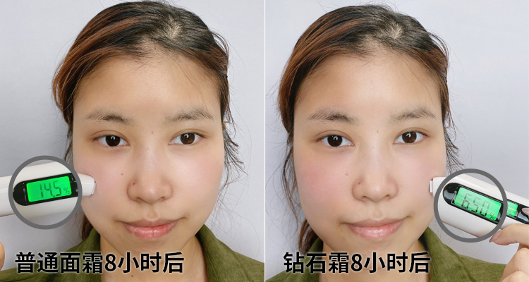 我还做了一个测评,正常护肤后,左边脸涂普通面霜,右边脸涂潘达钻石霜,8小时后的保湿效果对比。