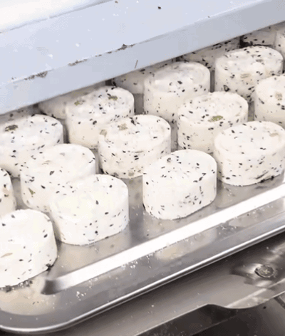 然后将料体分别灌入专门定制的模具压制,压制完成后,将糕点放入烤箱中慢火烘熟成型。