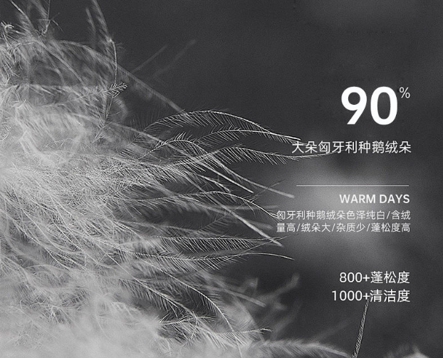 对比传统羽绒,匈牙利鹅绒的色泽纯白,含绒量高,绒朵大,杂质少,蓬松度也非常高。