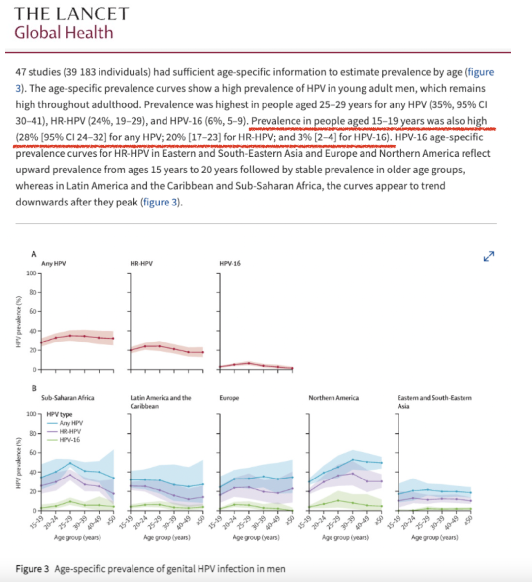 HPV 感染也并不是成年人的专属,有孩子的家长要注意,男性青少年的 HPV 感染率处于较高水平:一项全球系统性综述和荟萃分析显示[3,b],15~19 岁男孩任意 HPV 型别感染率达 28%。