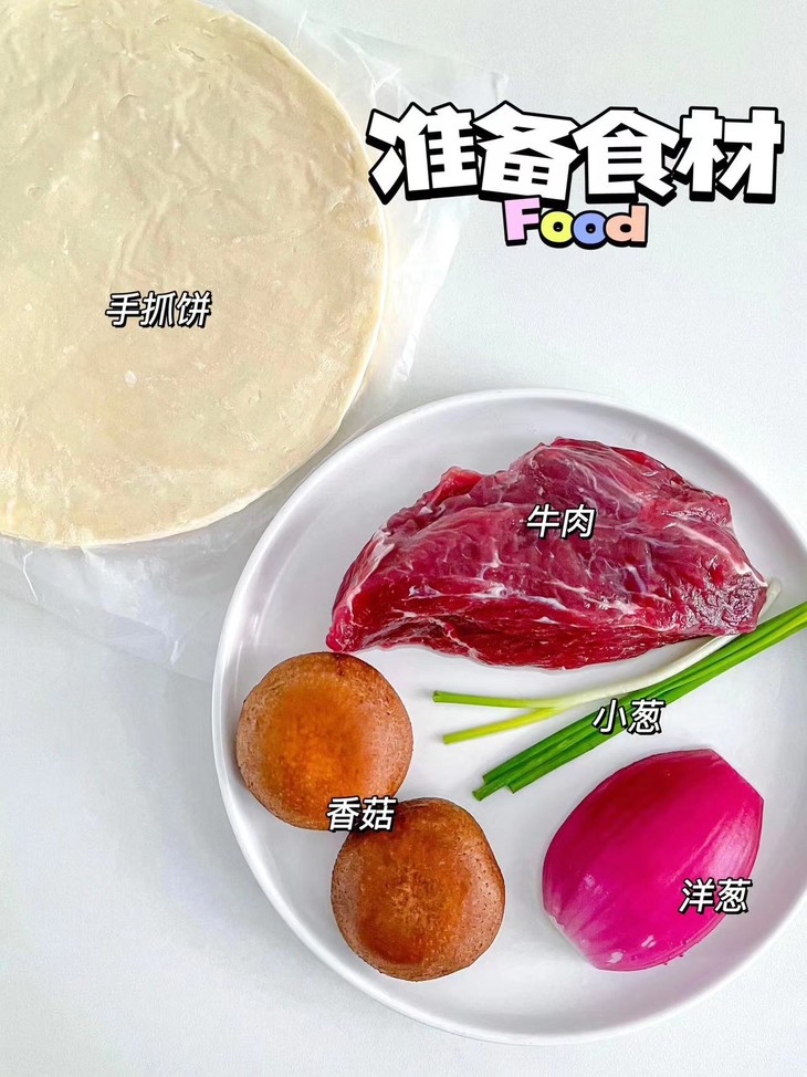 准备食材:手抓饼、牛肉、香菇、洋葱