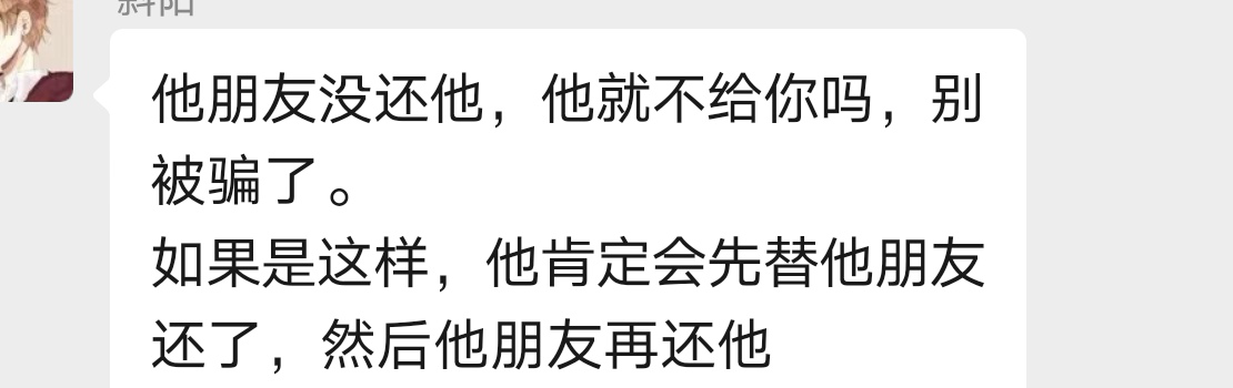 原因是朋友的朋友没还他。而且他现在没有上班,没有钱,在我的劝说下,他说一天还我10块钱。