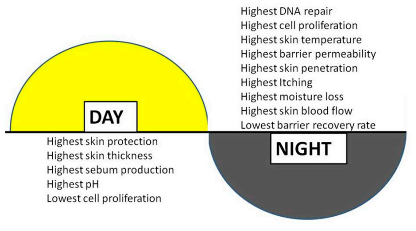 晚上则由另一对生物钟基因CP CLOCK和BMAL1开始占据主场,皮肤进入夜间修复模式。开始清除皮肤累积的氧化物等垃圾,修复DNA损伤以及白天受损的细胞,同时皮肤微循环加强,抓紧运输营养物质给前方皮肤细胞准备第二天作战。另外,晚上由于皮肤处于修复模式,皮肤屏障大门处于半开状态,所以此时如果投入关键补给品(比如A醇),会更容易进入皮肤,可以起到事倍功半的效果。