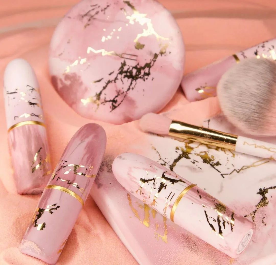 MAC这次把外壳设计成天然大理石纹路,再配上深浅不一的粉色,看似斑驳实则是点睛之笔的烫金色。