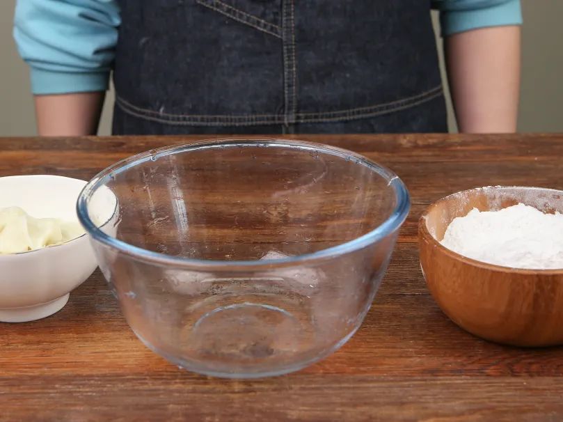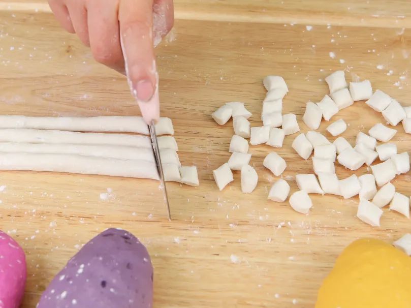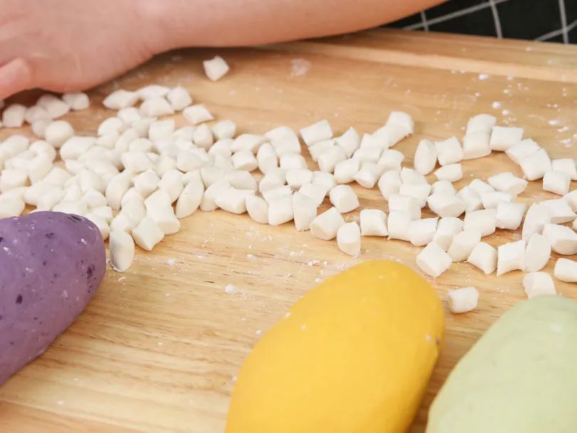 将白色山药口味的面团搓条并切小块,撒上手粉,防粘