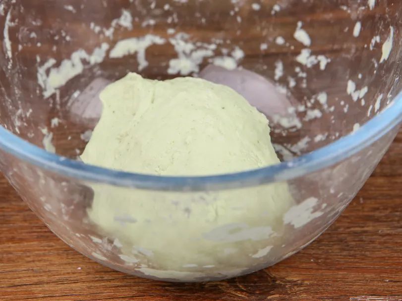 (右图)菠菜汁加入150g木薯淀粉及烫熟木薯团揉制均匀