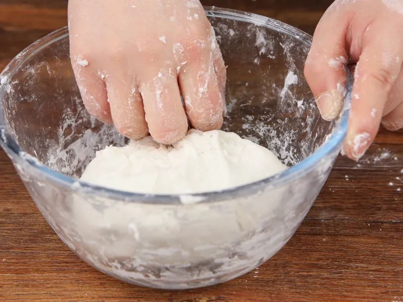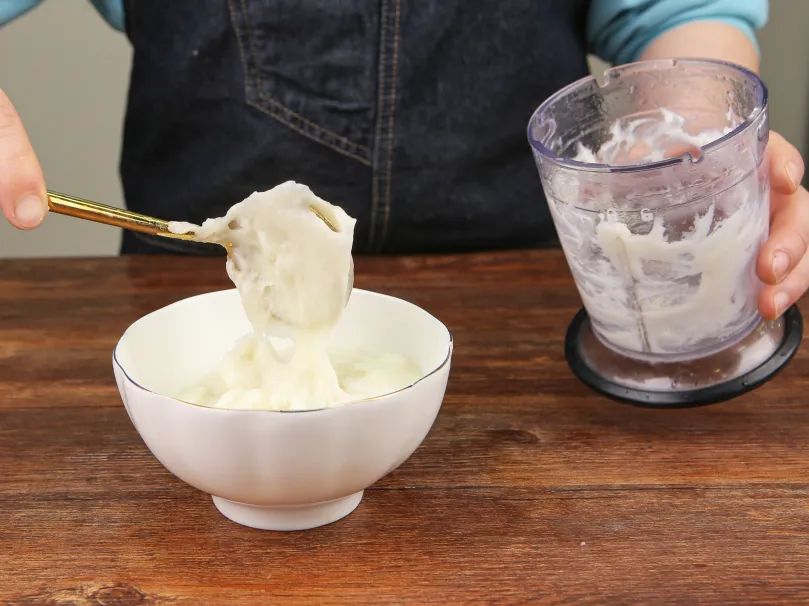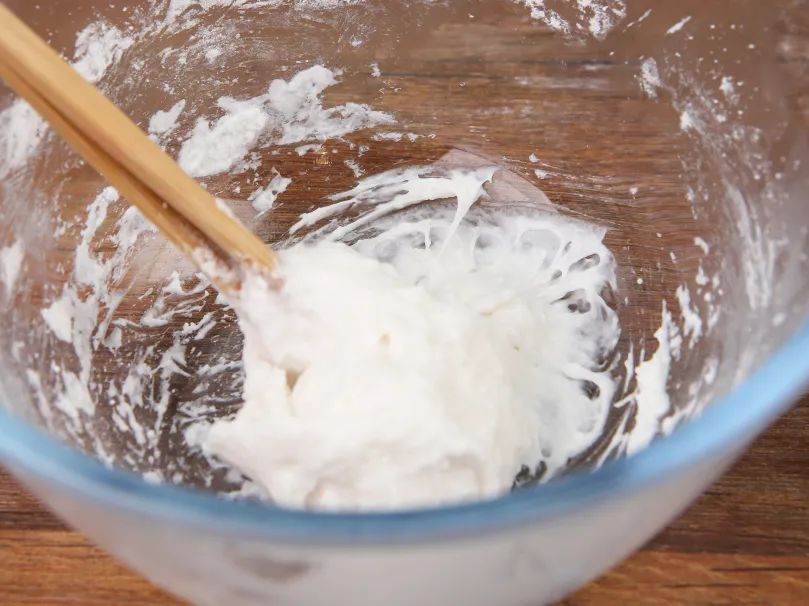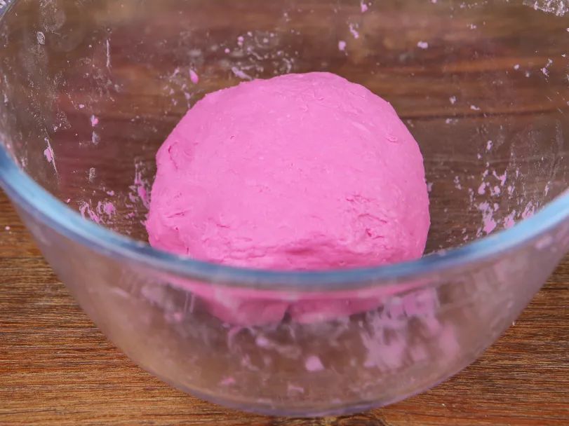 (左图)火龙果汁加入150木薯淀粉及烫熟木薯团揉制均匀