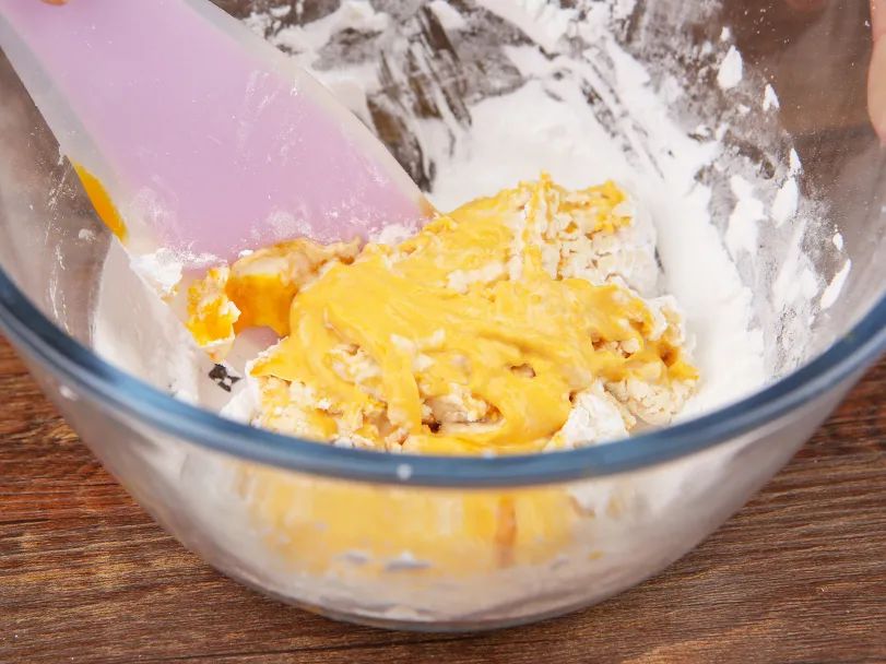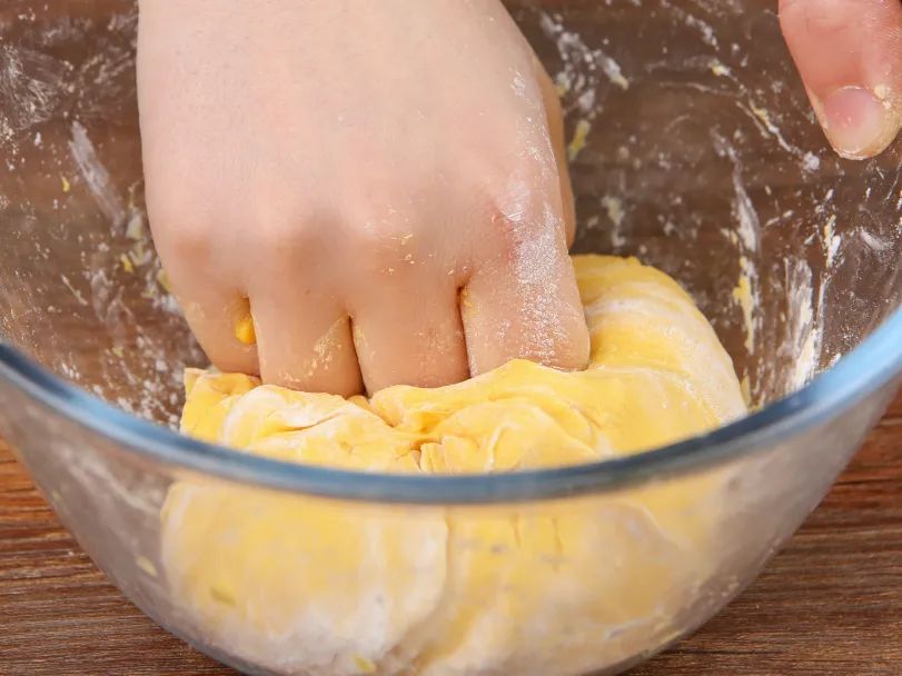 将山药泥加入150g木薯淀粉,并加入烫熟的木薯粉团,揉制均匀