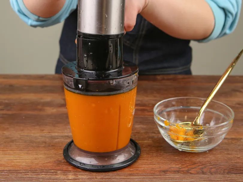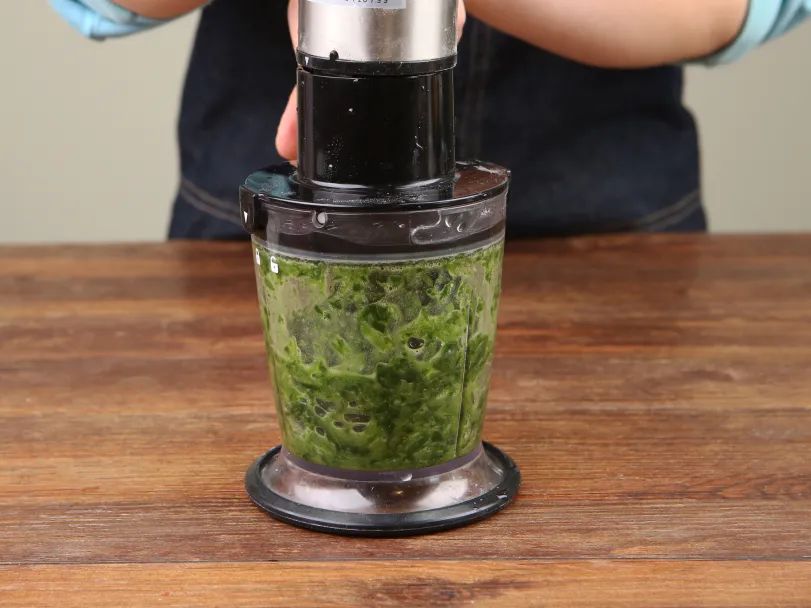 将热水焯过的菠菜加水榨汁过滤,取80g备用,蒸熟的南瓜压成泥,取出备用