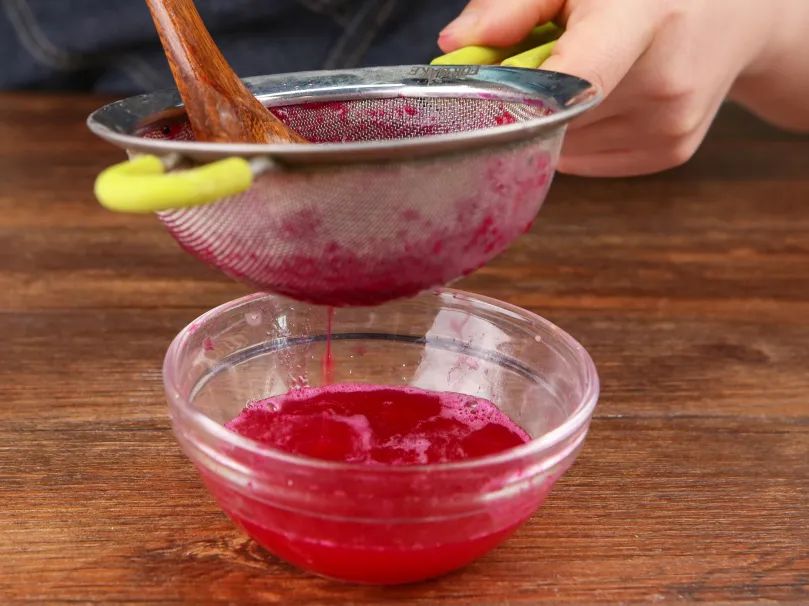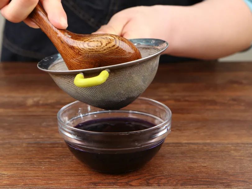 火龙果加少量水榨汁,取80g备用,温水泡过的蝶豆兰过滤留取液体,取80g备用
