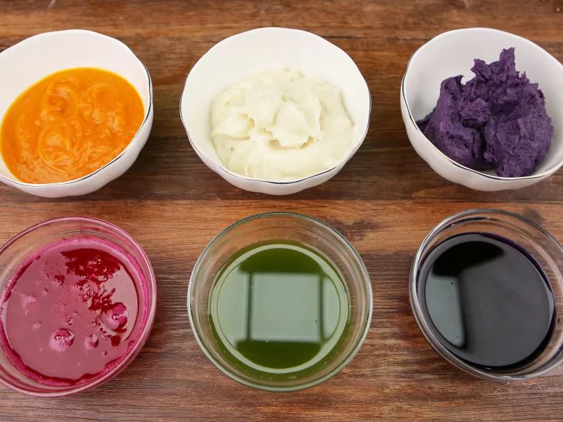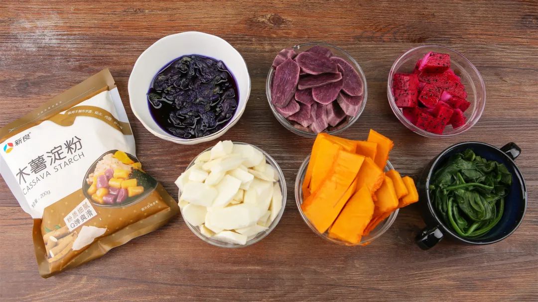 2,大家也可以不做这么多颜色,选几种方便的先试一试,食材中的木薯粉的量可供参考,具体揉制过程中,按蔬菜的吸水量而定。