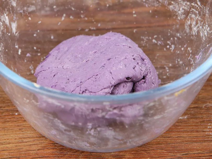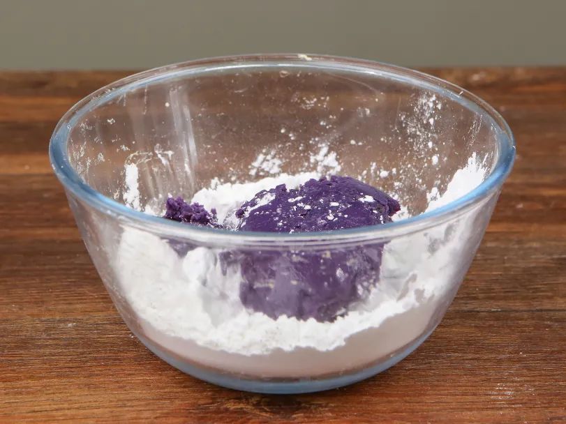 紫薯泥加入150g木薯淀粉及烫熟木薯团揉制均匀